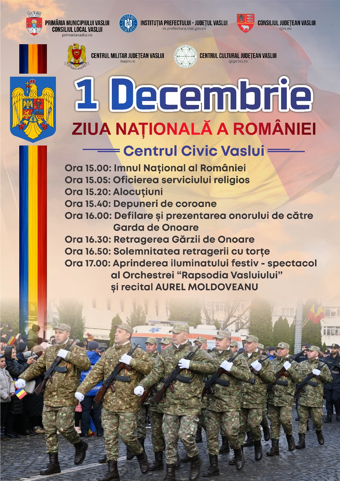 Consiliul Județean, Primăria municipiului Vaslui și Centrul Cultural Județean Vaslui ne invită pe toți, pe 1 Decembrie, să sărbătorim Ziua Națională a României, într-o atmosferă plină de emoție, tradiție și bucurie. Programul: