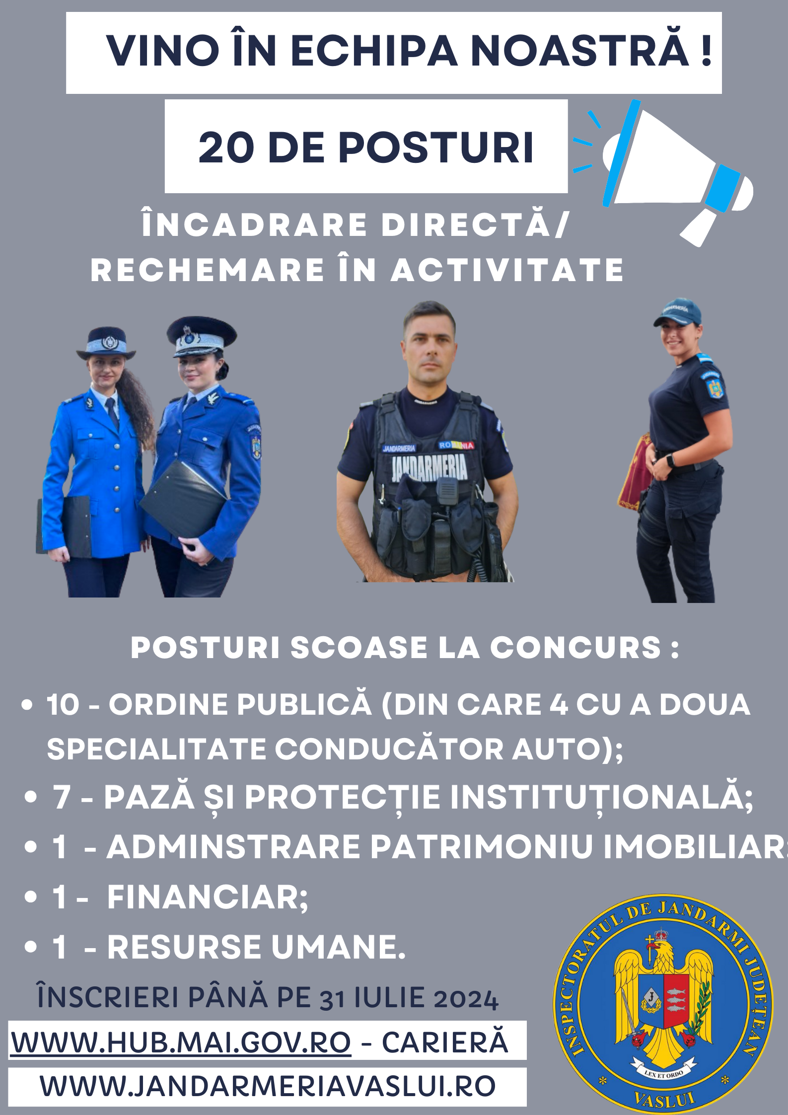 – 4 posturi de subofițer operativ principal (cu a doua specialitate conducător auto), specialitatea ordine publică (1 în Vaslui, 1 în Negrești, 2 în Huși);