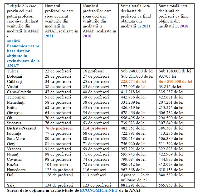 Doar 38 de profesori din județul Vaslui (locul 39 din 42) au declarat la A.N.A.F. că au realizat venituri din meditaţii, în valoare cumulată de 177.000 de lei, în anul calendaristic 2021, arată datele obţinute de site-ul Economica.net. La nivel național, a fost vorba despre 7.900 de profesori Cele mari venituri nete declarate de profesori din meditaţii au fost realizate în Bucureşti – 24,4 milioane de lei, Cluj – 5,85 milioane de lei și Timiş – 3,75 de milioane de lei, iar cele mai mici, în Vaslui, Botoșani – 211.000 de lei și Călărași – 226.000 de lei.