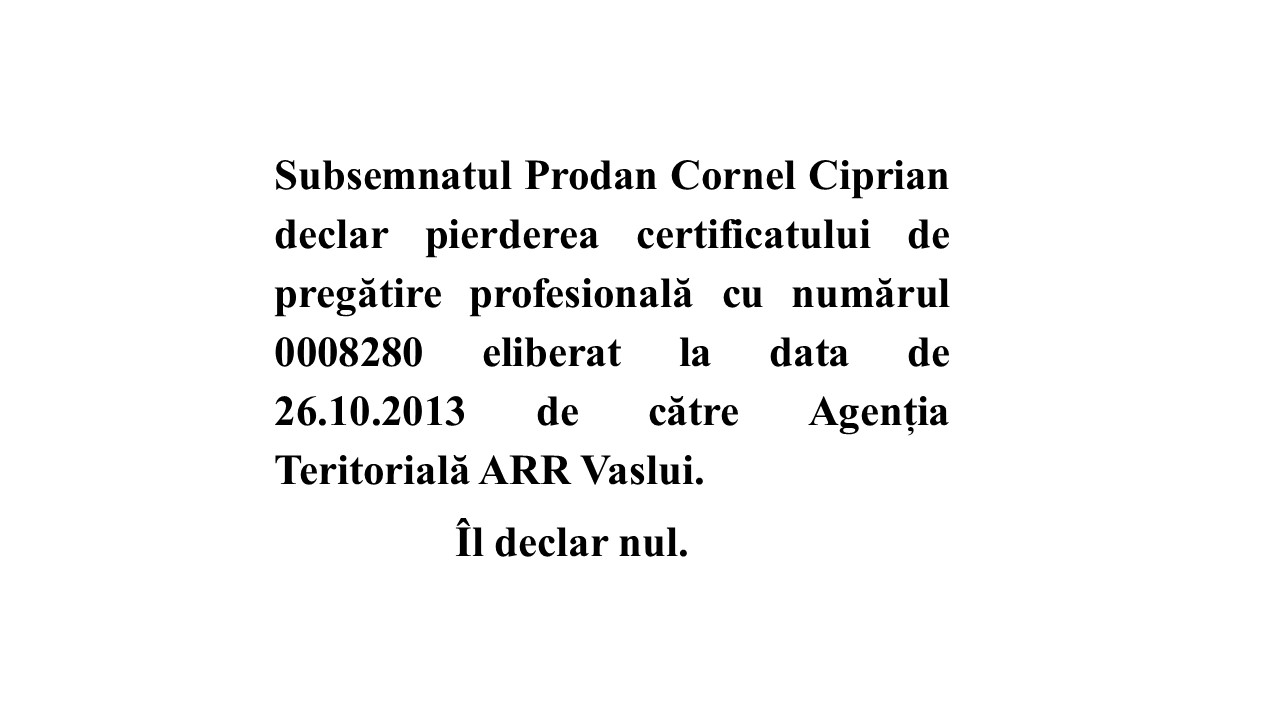 Subsemnatul Prodan Cornel Ciprian declar pierderea certificatului de pregătire profesională cu numărul 0008280 eleberat la data de 26.10.2013 de către Agenția Teritorială ARR Vaslui.Îl declar nul.