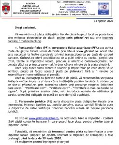 Vă reamintim că plata obligaţiilor fiscale către bugetul local se poate face prin mijloace electronice de plată: online (prin ghiseul.ro) sau prin internet banking / mobile banking.