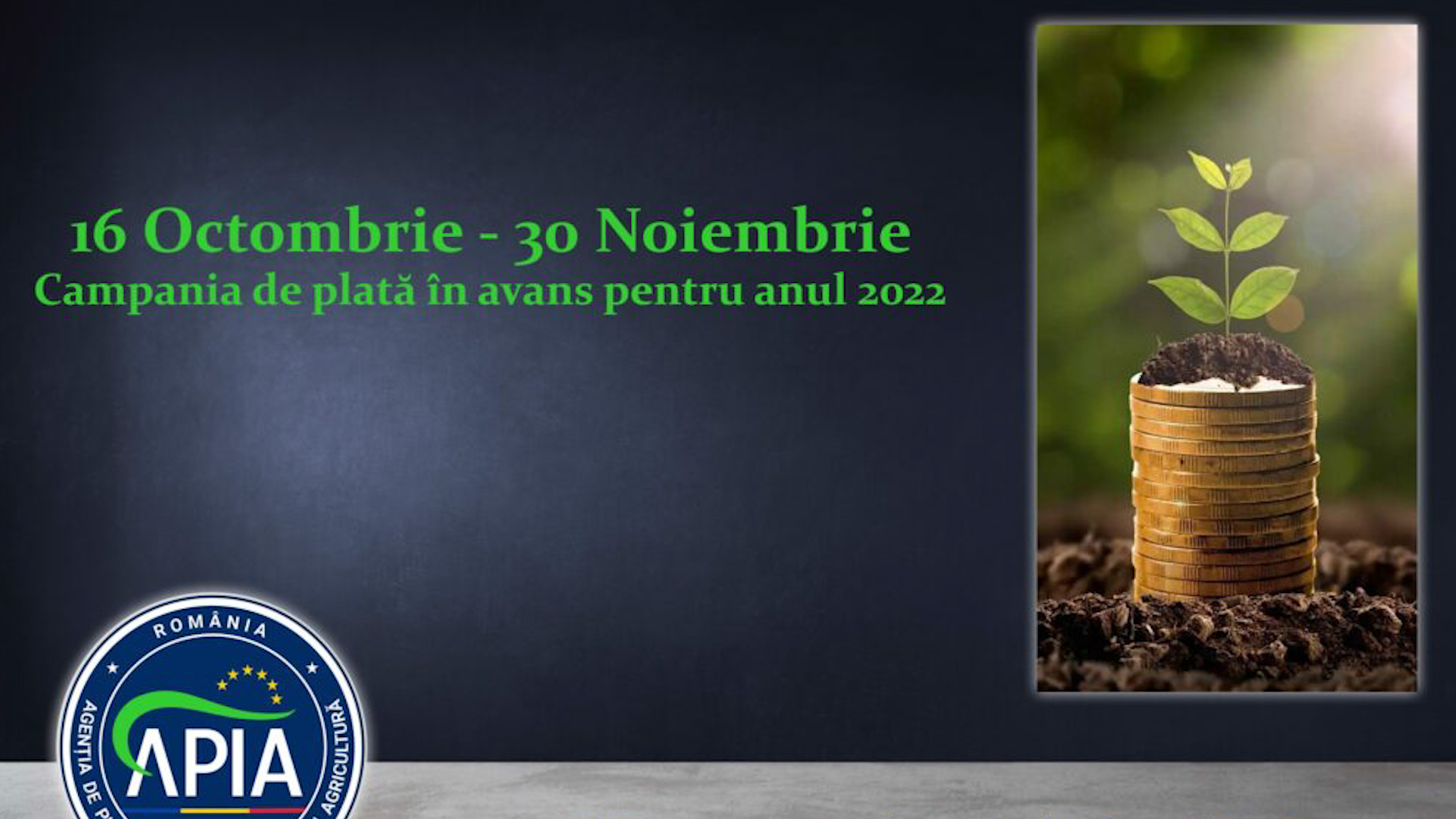 Campania de plăţi în avans se va derula în perioada 16 octombrie – 30 noiembrie 2022, Agenţia de Plăţi şi Intervenţie pentru Agricultură urmând să finanţeze fermierii cu o sumă de peste 1 miliard de euro, atât pentru schemele finanţate din FEGA cât şi pentru măsurile finanţate din FEADR.