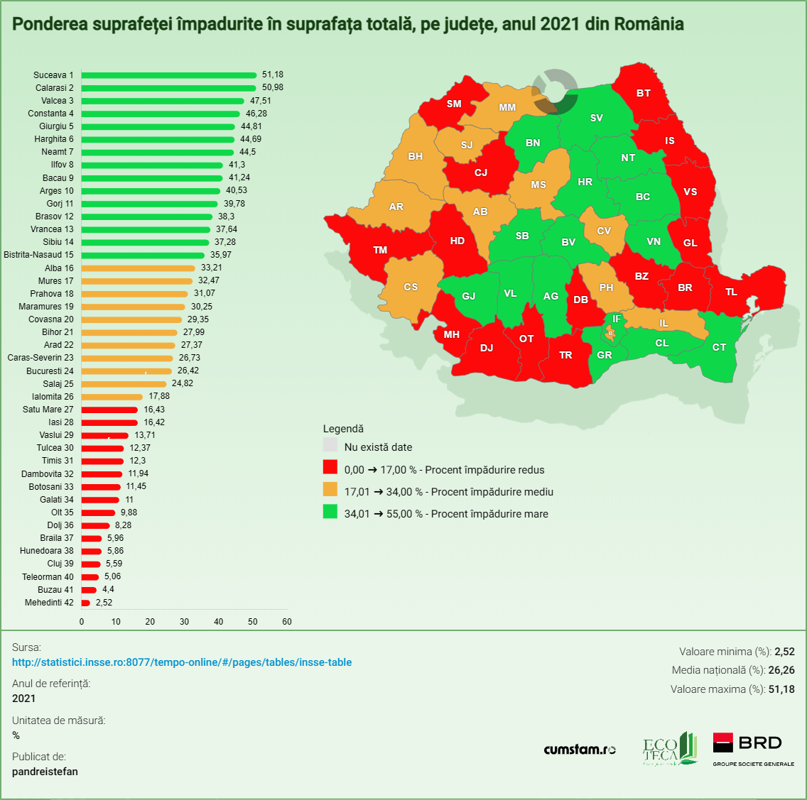”Conform datelor prelucrate pentru Raportul anual privind starea mediului în județul Vaslui pe anul 2023, zonele cu deficit de vegetaţie forestieră sunt situate în partea de est şi sud-est, cauzele fiind defrişările masive de până în decembrie 1989 şi redarea terenurilor către circuitul agricol. Disponibilități de împădurire la nivelul județului prezintă comunele Șuletea, Arsura, Fălciu, Drânceni, Băceşti, Rebricea, Dodeşti şi Tăcuta. În Strategia Forestieră Națională 2018-2027, se preconizează o majorare a suprafeţei ocupate cu vegetaţie forestieră la 14% la nivelul judeţului Vaslui, prin împăduriri în terenuri degradate inapte pentru agricultură şi prin împăduriri în vederea realizării Sistemului naţional de perdele forestiere de protecţie. Invităm vasluienii să abordeze acest program (https://www.primaimpadurire.ro/ghid-impaduriri-pnrr/), data limită de depunere a dosarelor fiind 23 ianuarie 2026, întrucât cele 325 de milioane de euro disponibile (după modificarea Planului Național de Redresare și Reziliență) pentru împădurirea a 27.000 de ha se vor împărți pe principiul „primul venit, primul servit”, fără criterii de selecție a dosarelor”, a declarat Mihaela Budianu, director executiv al Agenției pentru Protecția Mediului (APM) Vaslui.