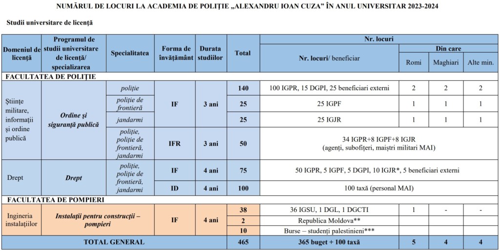 Anul acesta, la Academia de Poliție „Alexandru Ioan Cuza”, Facultatea de Poliție, programul de studii „Ordine și siguranță publică” au fost scoase la concurs, la învățământ cu frecvență, 140 de locuri la specialitatea poliție, 25 pentru poliția de frontieră și 25 la jandarmi, iar la învățământ cu frecvență redusă, pentru cele 3 specializări sunt 50 de locuri.