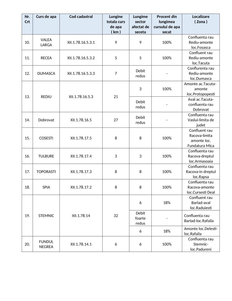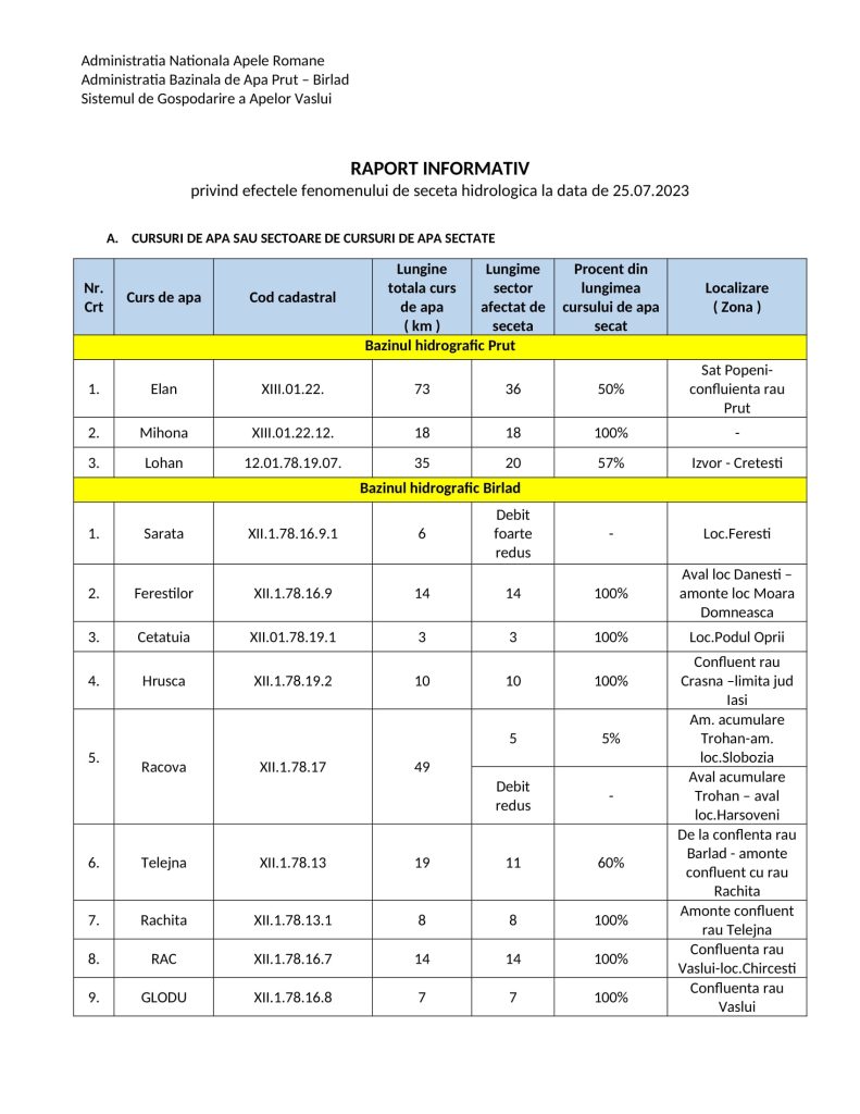 1. Monitorizarea zilnică a rețelei hidrografice din administrare, privind apariția de râuri sau sectoare de râu secate. Coordonarea acțiunii este făcută de șefii de formații de lucru, cu raportare săptămânală la dispeceratul unității.