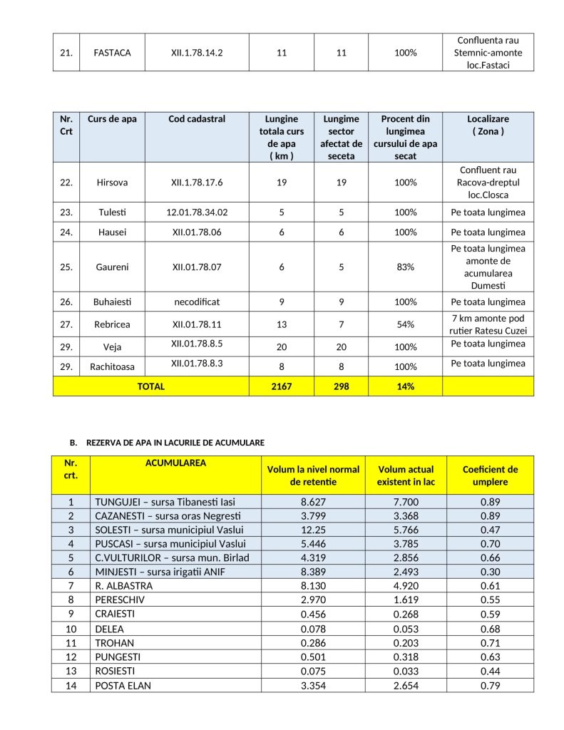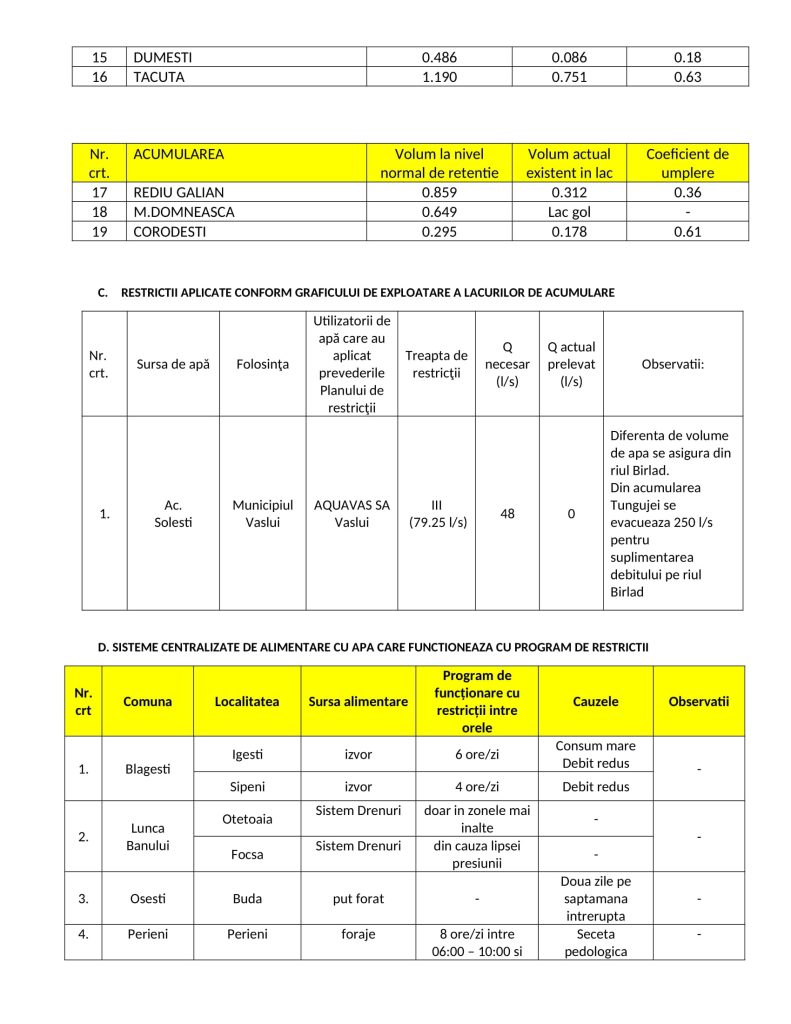 6. Aplicarea treptei a 3-a de restricții pentru Acumularea Solești, care este sursa de alimentare cu apă a municipiului Vaslui (debit contractat – 80 l/s; debit restricționat – 48 l/s). Pentru alimentarea cu apă a municipiului Vaslui se folosesc surse suplimentare – Acumularea Pușcași și râul Bârlad (priza de apă Rediu). (D.R.)