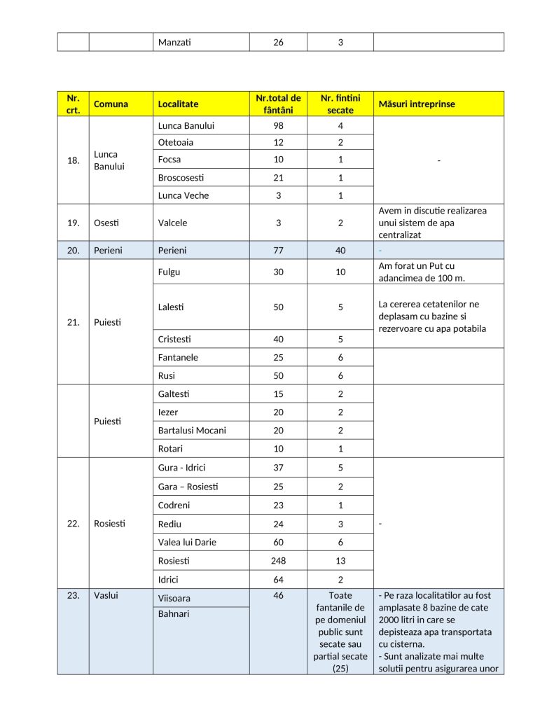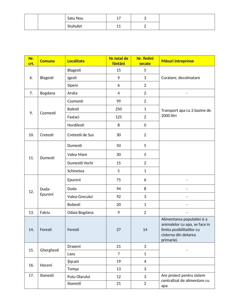 5. Monitorizarea și actualizarea săptămânală a situației privind asigurarea alimentării cu apă a populației din localitățile care nu dispun de sisteme centralizate.
