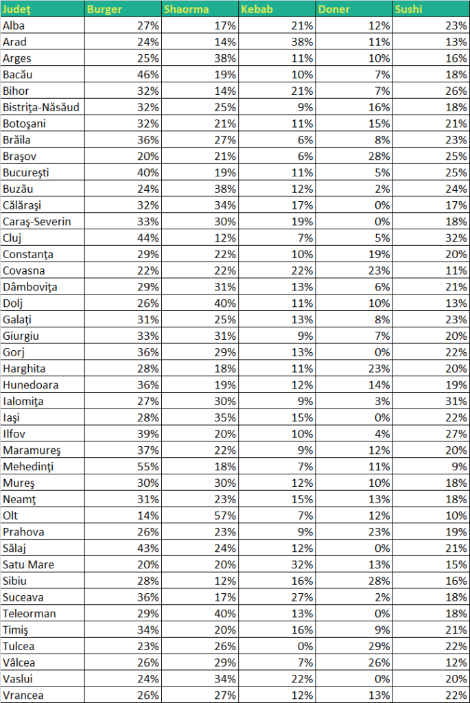 – Din peste 100 de feluri de mâncare analizate, cele mai populare s-au dovedit a fi pizza, burger, shaorma, kebab, doner şi sushi.