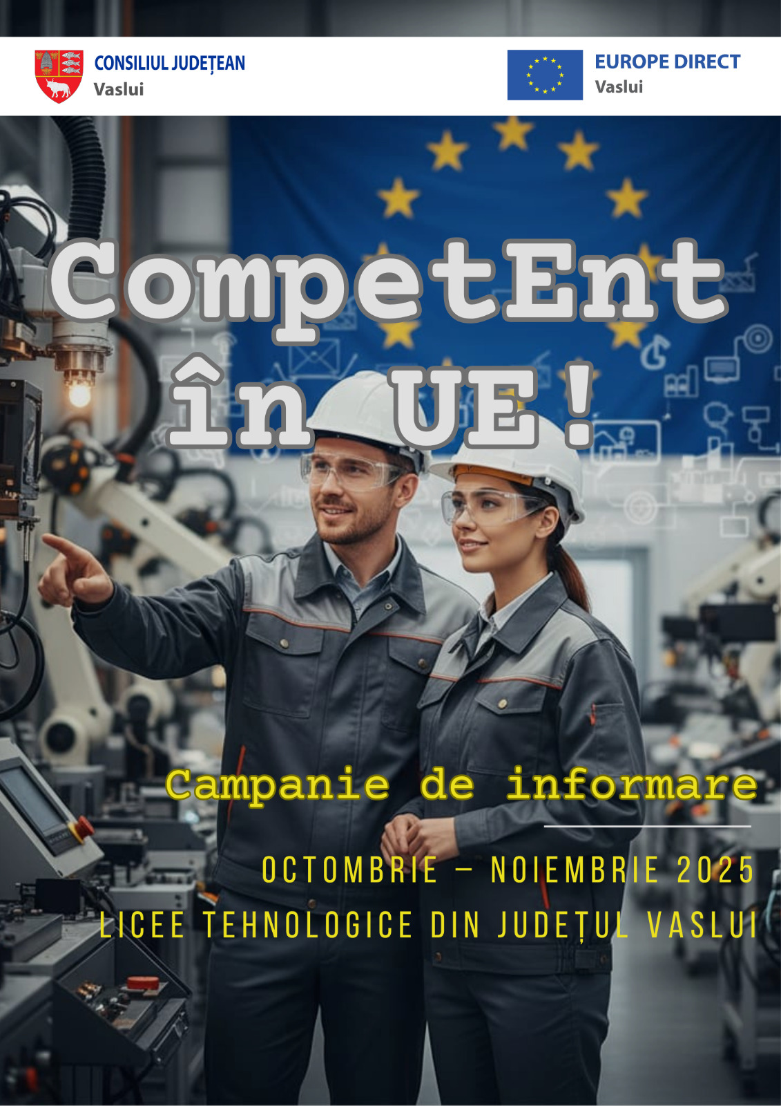Centrul ”Europe Direct” Vaslui, a cărui structură gazdă este Consiliul Județean, va desfășura, în perioada octombrie-noiembrie, Campania de informare ,,CompetEnt în UE”, cu scopul promovării informațiilor de interes pentru stimularea tinerilor din liceele tehnologice/școlile profesionale din mediul rural/periurban mic în vederea finalizării studiilor, cu obținerea unei competențe în domeniul lor. Campania va conține 8 vizite în tot atâtea unități de învățământ din județul Vaslui, unde accesul la informația europeană este mai dificil, și este dedicată tinerilor din anii terminali, după cum urmează: Liceul Tehnologic ,,Ghenuță Coman” Murgeni, Liceul Tehnologic ,,Marcel Guguianu” Zorleni, Liceul Tehnologic ,,Dimitrie Cantemir” Fălciu, Liceul Tehnologic Puiești, Liceul ,,Ștefan cel Mare” Codăești, Liceul Tehnologic ,,Petru Rareș” Vetrișoaia, Liceul Tehnologic Vladia, Liceul Tehnologic ,,Ion Mincu” Vaslui.