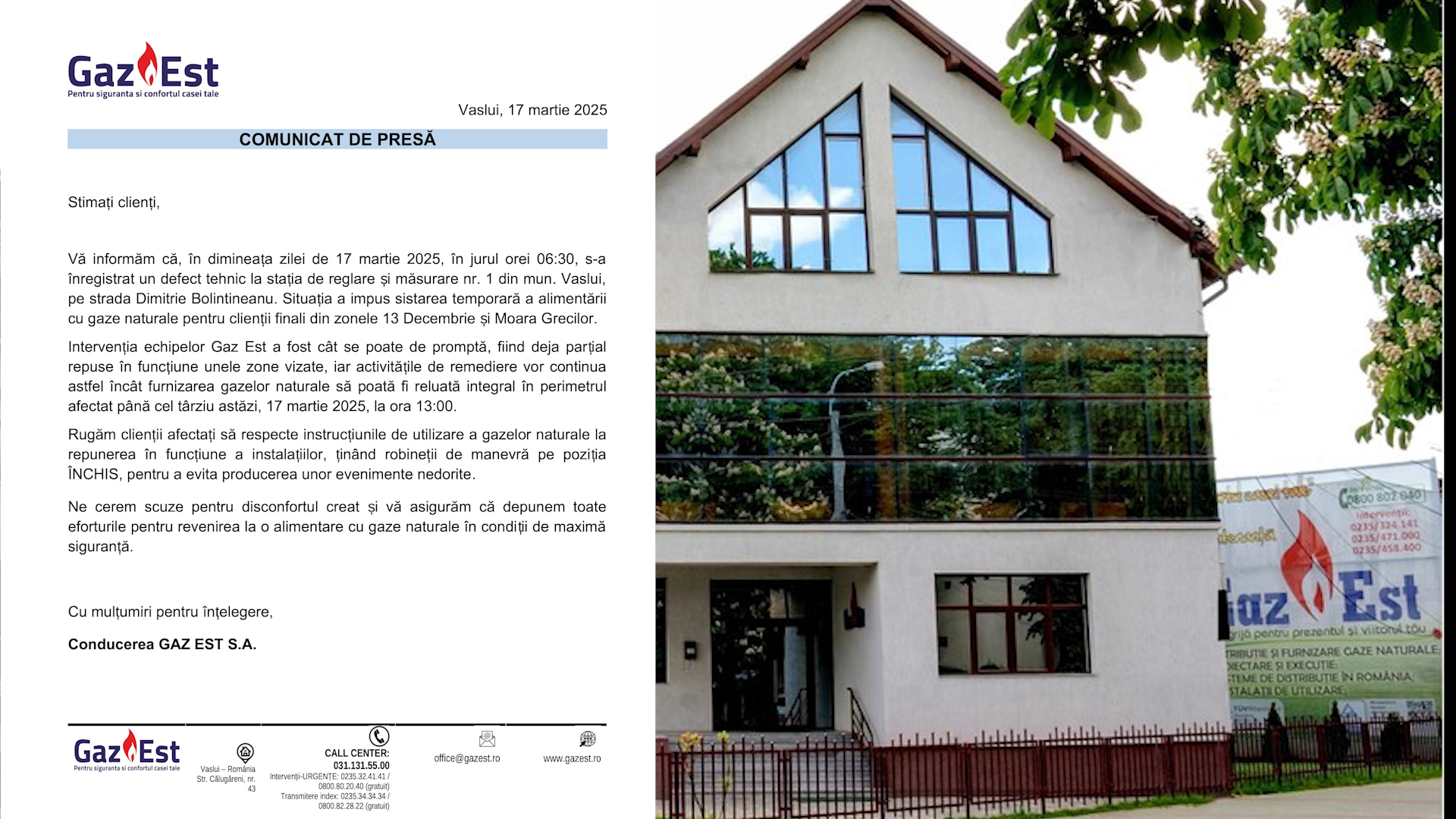 Vă informăm că, în dimineața zilei de 17 martie 2025, în jurul orei 06:30, s-a înregistrat un defect tehnic la stația de reglare și măsurare nr. 1 din mun. Vaslui, pe strada Dimitrie Bolintineanu. Situația a impus sistarea temporară a alimentării cu gaze naturale pentru clienții finali din zonele 13 Decembrie și Moara Grecilor.