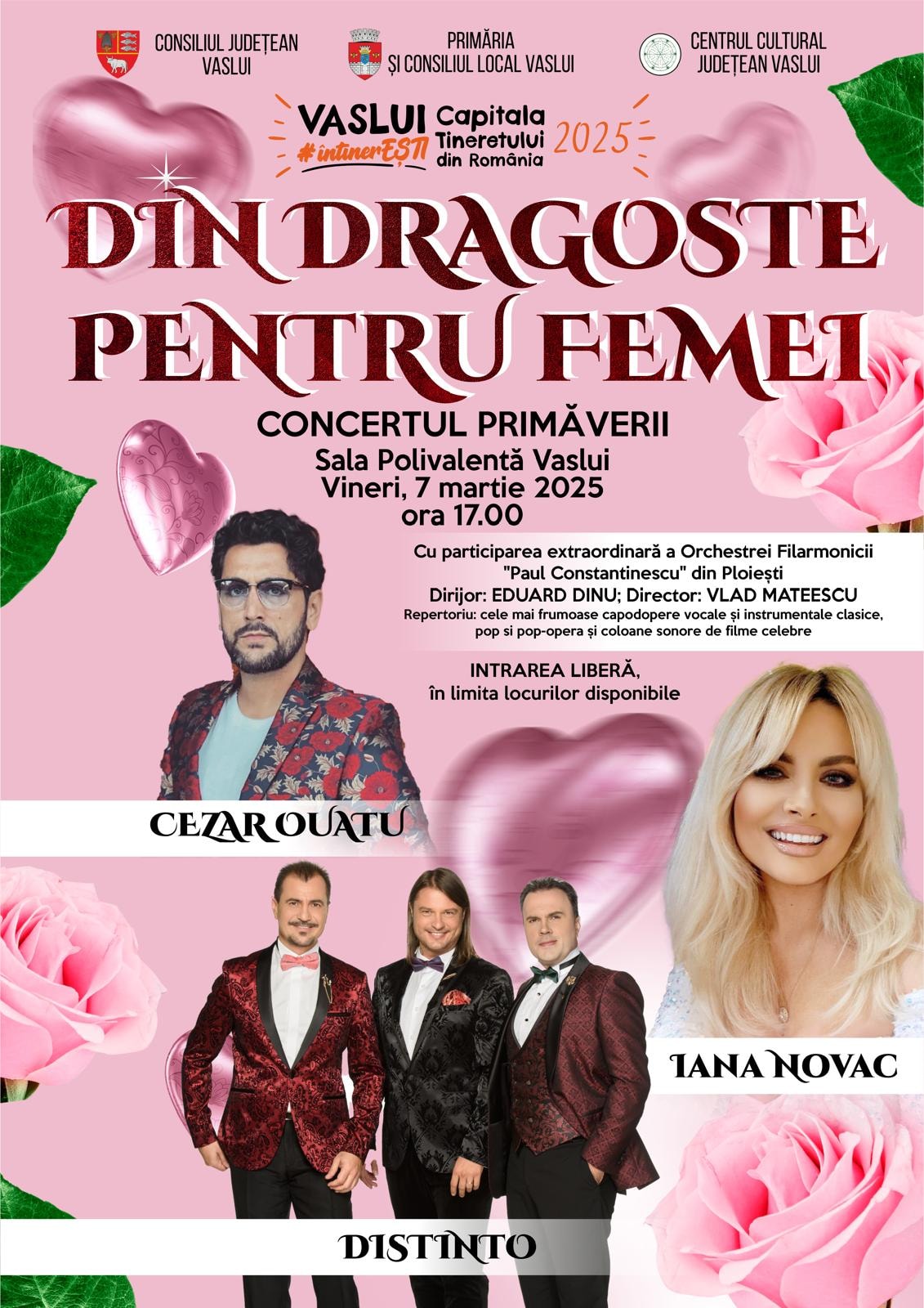 Ediţia 2025 a Concertului Primăverii de la Vaslui va fi o premieră artistică – un concert extraordinar conceput în mod special şi oferit FEMEII. Capodopere vocale şi instrumentale clasice, pop şi pop-opera, coloane sonore din filme celebre şi duete de excepţie vor fi prezentate publicului de nume sonore ale scenei naţionale -Cezar Ouatu, Iana Novac şi Distinto, în acompaniamentul Orchestrei Filarmonicii “Paul Constantinescu“ din Ploieşti, director Vlad Mateescu, dirijor Eduard Dinu.