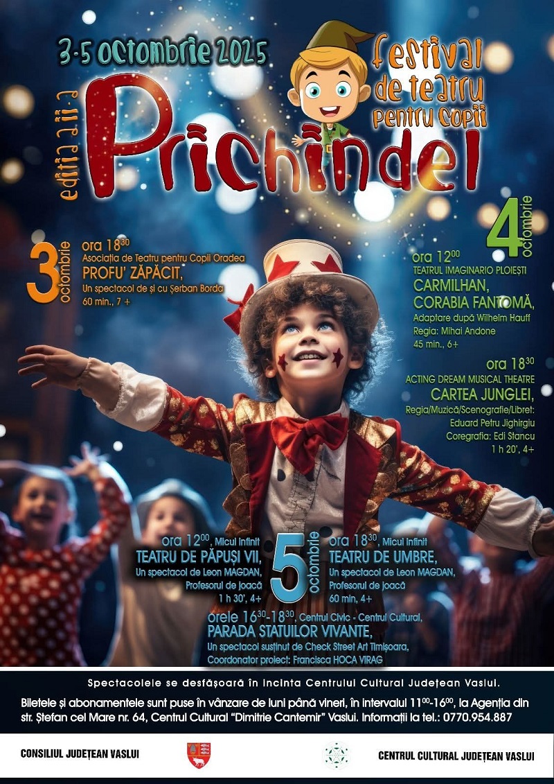 În perioada 3-5 octombrie, Vasluiul va găzdui cea de-a doua ediție a Festivalului de teatru pentru copii „Prichindel”, un eveniment care aduce pe scenă magie, zâmbete și spectacole pentru întreaga familie. Timp de trei zile, atât cei mici, cât și cei mari vor avea ocazia să se bucure de cinci piese de teatru pline de energie și culoare.