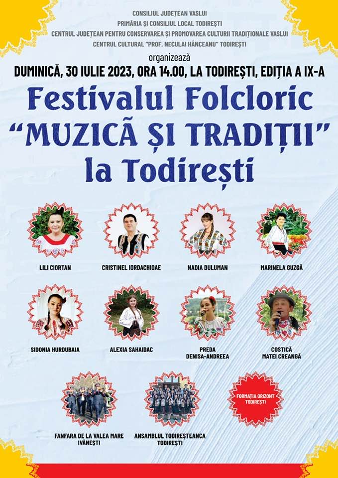 Muzica și voia bună sunt anunțate pentru duminică, 30 iulie, în comuna Todirești. Ziua localității va fi marcată prin organizarea Festivalului folcloric ”Muzică și Tradiții” – ediția a IX-a, care va include un grandios spectacol avându-i în distribuție pe: Lili Ciortan, Cristinel Iordăchioae, Nadia Duluman, Marinela Guzgă, Sidonia Hurdubaia, Alexia Sahaidac, Andreea-Denisa Preda, Costică Matei Creangă, Fanfara de la Valea Mare Ivănești și Ansamblul ”Todireșteanca”. Organizatori sunt Primăria și Consiliul Local Todirești, Consiliul Județean Vaslui, Centrul Județean pentru Conservarea și Promovarea Culturii Tradiționale, Centrul Cultural ”Prof. Neculai Hânceanu” Todirești.