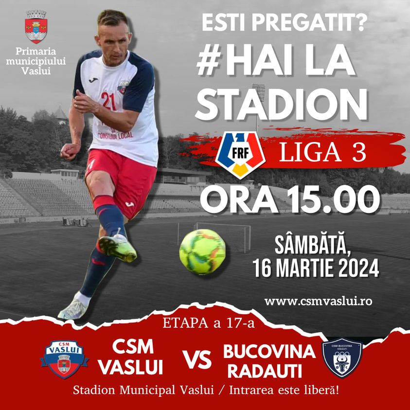 CSM Vaslui revine acasă în campionatul Ligii 3, seria 1, cu un meci în fața echipei CSM Bucovina Rădăuți, deja calificată în play-off. Partida are loc sâmbătă, 16 martie, de la ora 15, pe stadionul Municipal, iar intrarea este liberă.
