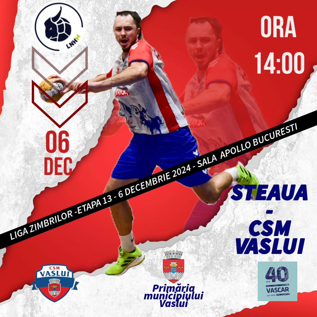 Astăzi, CSM Vaslui o va întâlni în deplasare pe Steaua, în etapa a XIII-a a Ligii Zimbrilor. Formația noastră speră să facă o frumoasă surpriză în fața bucureștenilor și să înregistreze astfel a treia victorie la rând! În prezent, echipa vasluiană este pe locul 8 în clasament, iar Steaua ocupă poziția a 12-a.