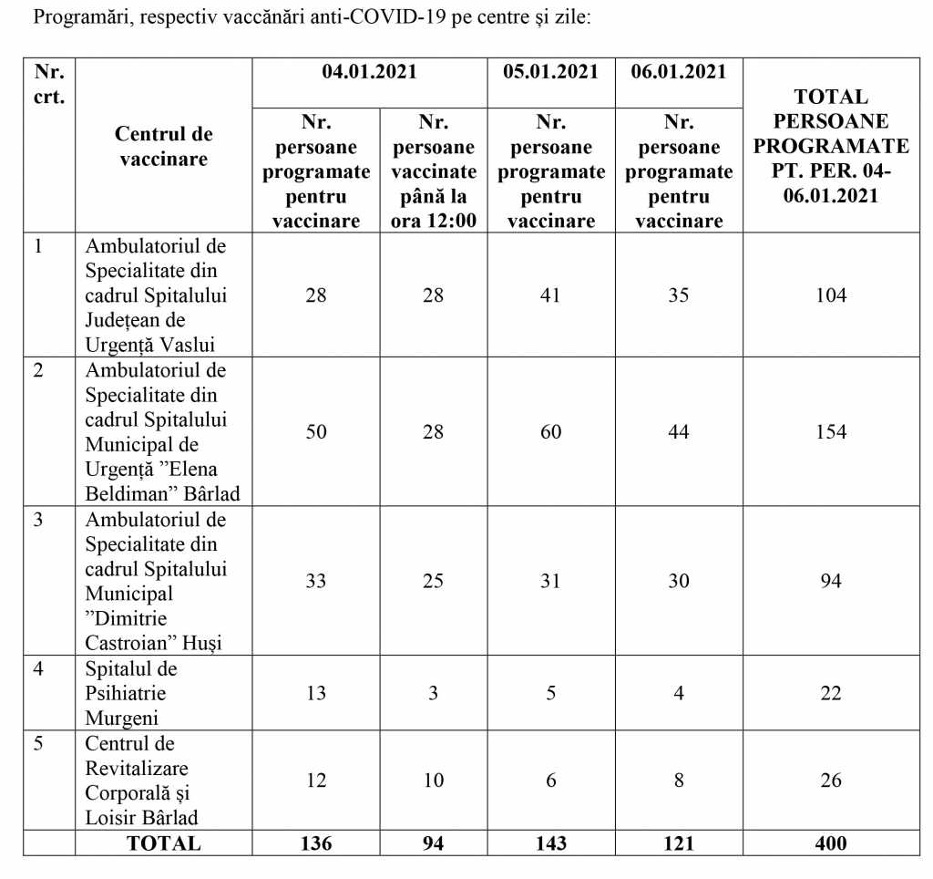 Centrele pentru etapa I, în care se va desfaşura vaccinarea la nivelul județului Vaslui, sunt următoarele: