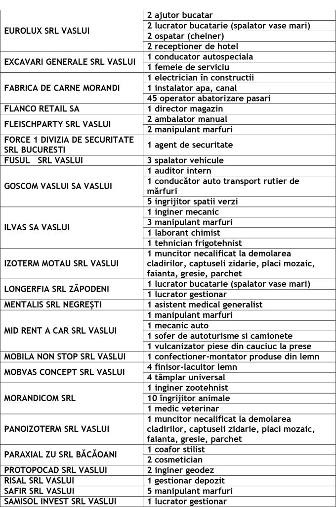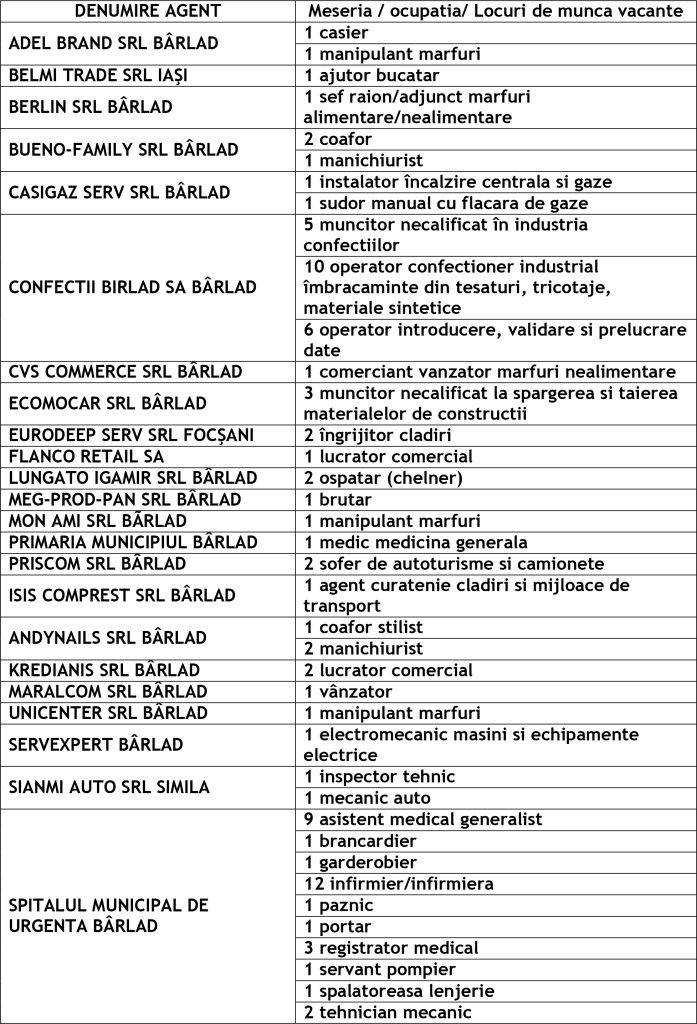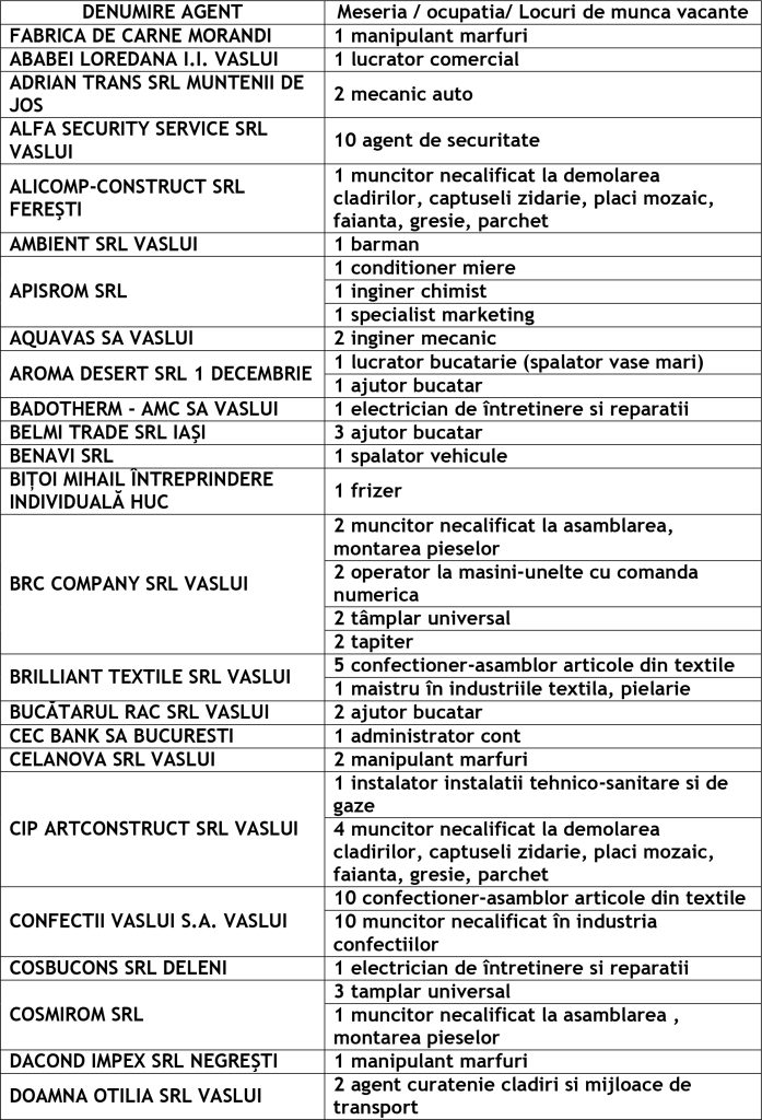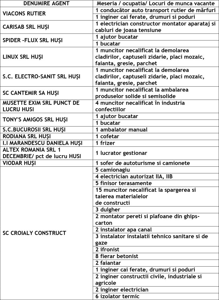 Potrivit datelor rezultate din ofertele angajatorilor privind locurile de muncă vacante, în evidențele Agenției Județene pentru Ocuparea Forței de Muncă Vaslui sunt înregistrate 448 locuri de muncă disponibile la fiecare agenție locală din județ cum ar fi: Agenția Locală Vaslui 245, Agenția Locală Bârlad 122, Agenția Locală Huși 81 locuri de muncă.