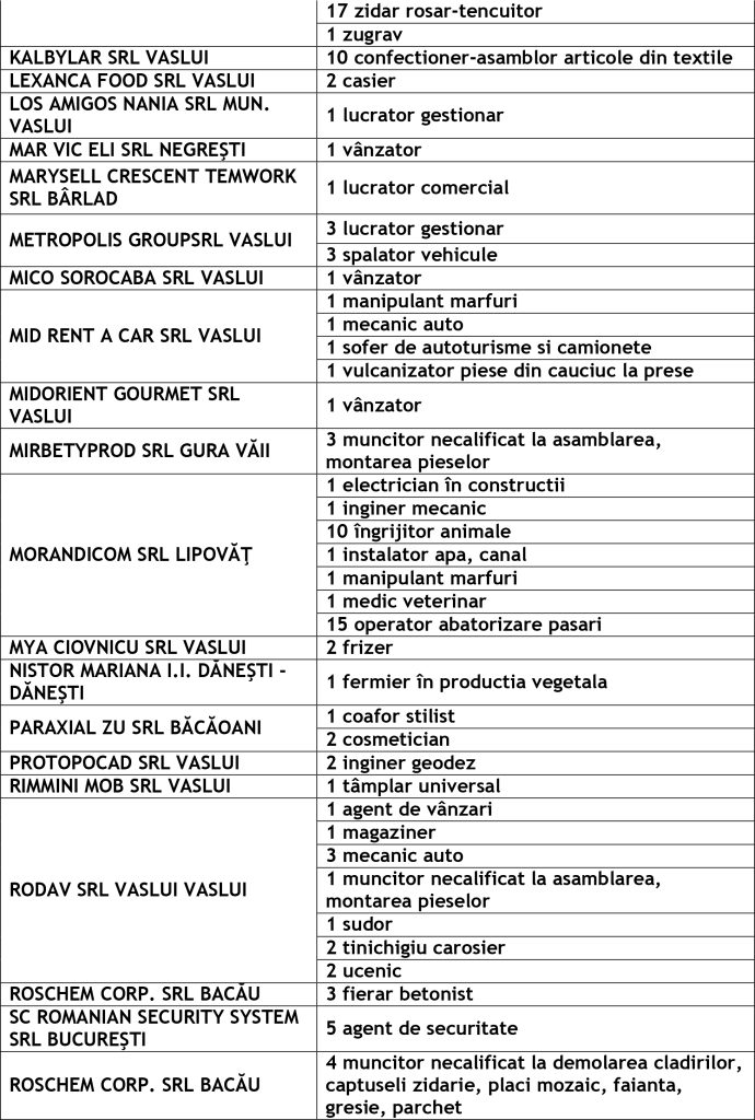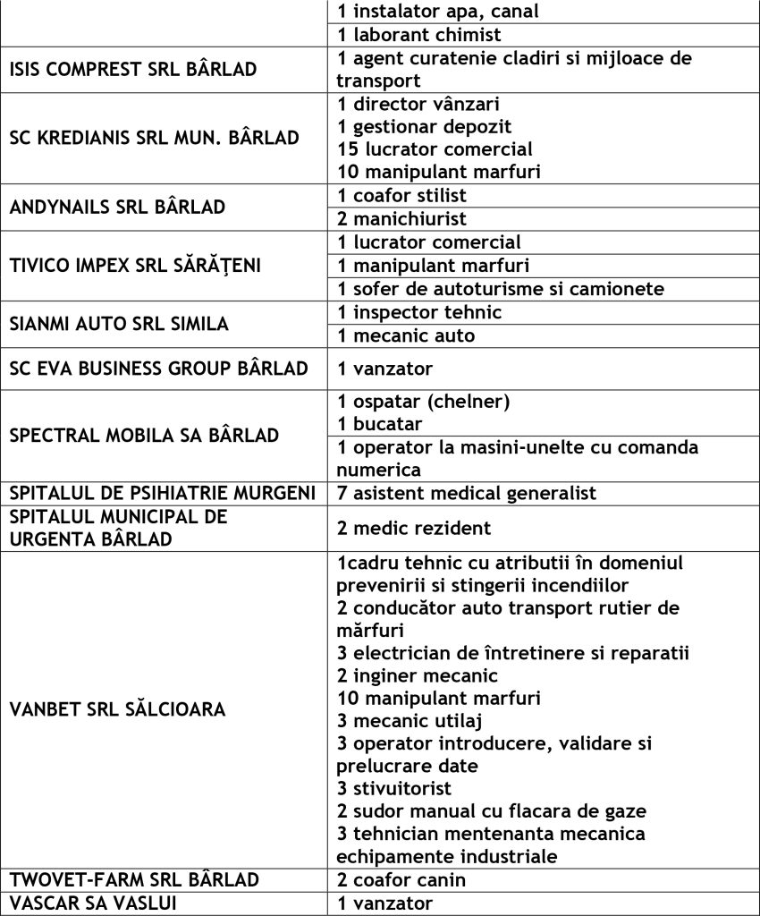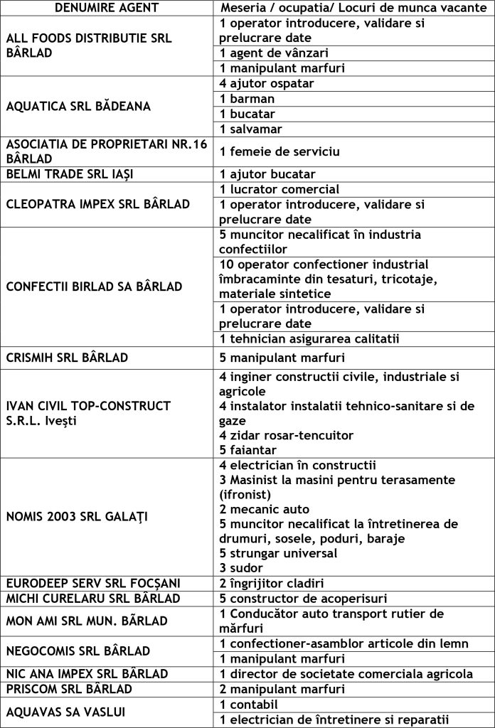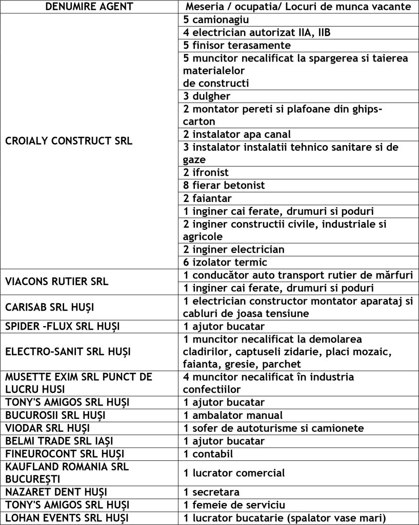 Potrivit datelor rezultate din ofertele angajatorilor privind locurile de muncă vacante, în evidențele Agenției Județene pentru Ocuparea Forței de Muncă Vaslui sunt înregistrate un număr semnificativ de locuri de muncă disponibile la fiecare agenție locală din județ cum ar fi: Agenția Locală Vaslui, Bârlad și Huși