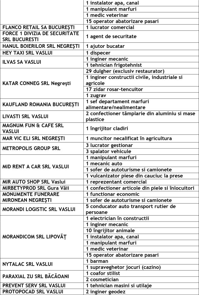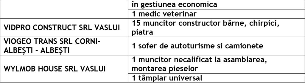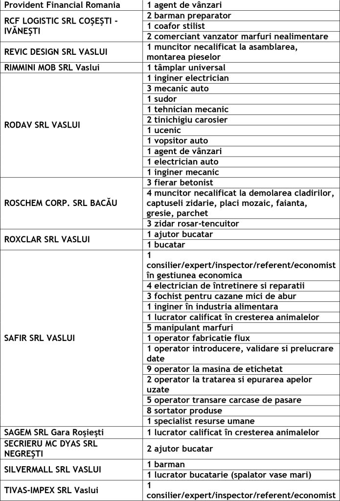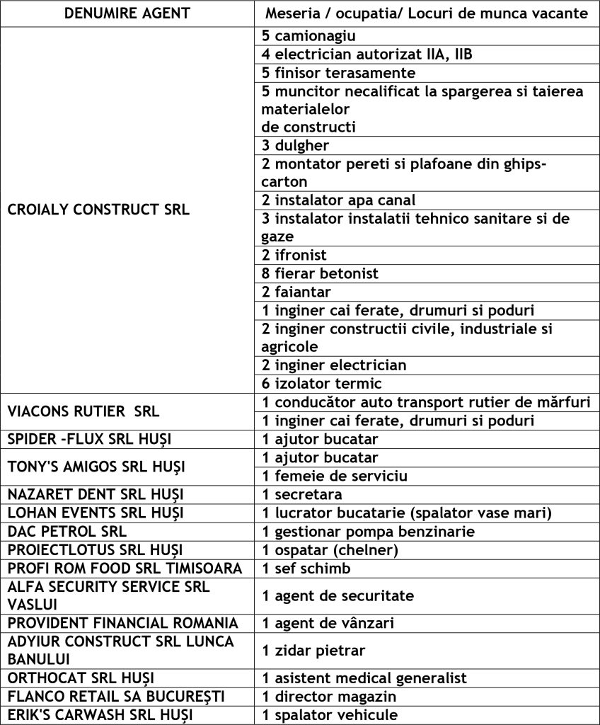 Potrivit datelor rezultate din ofertele angajatorilor, în evidențele Agenției Județene pentru Ocuparea Forței de Muncă Vaslui sunt disponibile la agențiile locale din Vaslui, Bârlad și Huși următoarele locuri de muncă vacante: