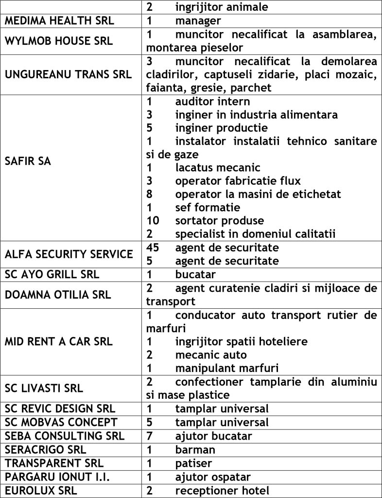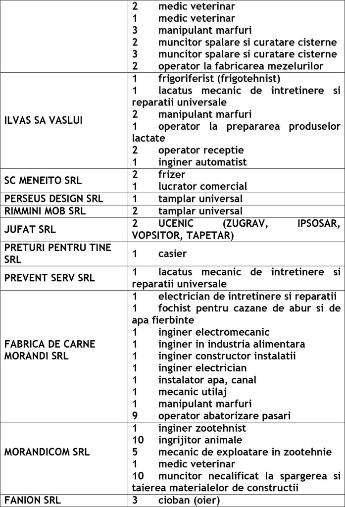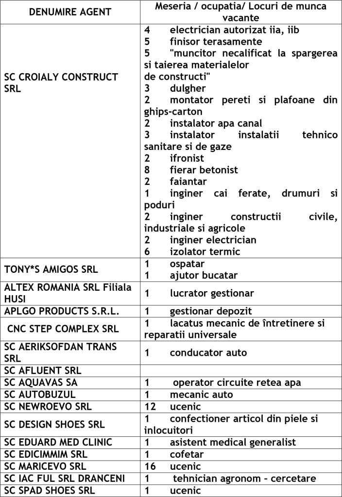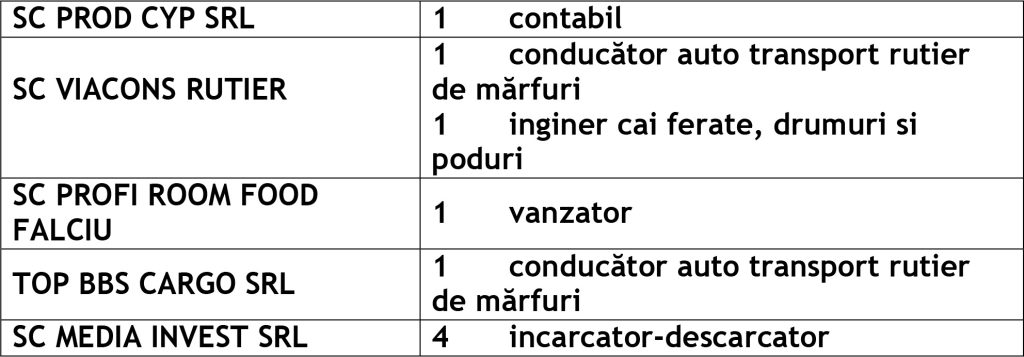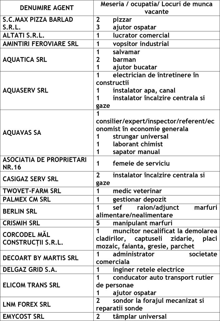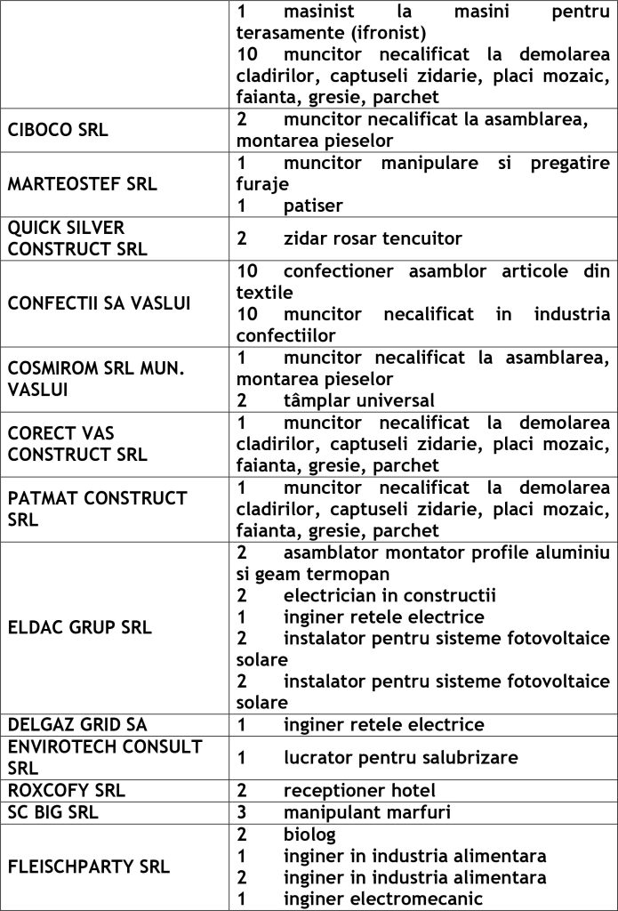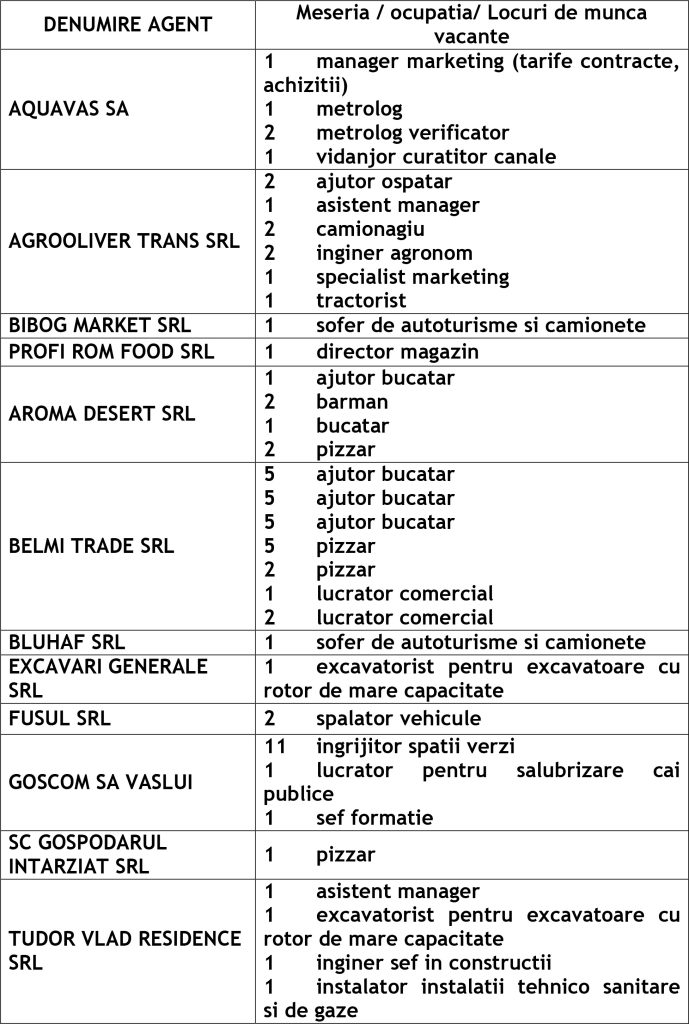 Potrivit datelor rezultate din ofertele angajatorilor privind locurile de muncă vacante, în evidențele Agenției Județene pentru Ocuparea Forței de Muncă Vaslui sunt înregistrate 505 locuri de muncă disponibile la fiecare agenție locală din județ cum ar fi: Agenția Locală Vaslui 332, Agenția Locală Bârlad 76, Agenția Locală Huși 97 locuri de muncă.