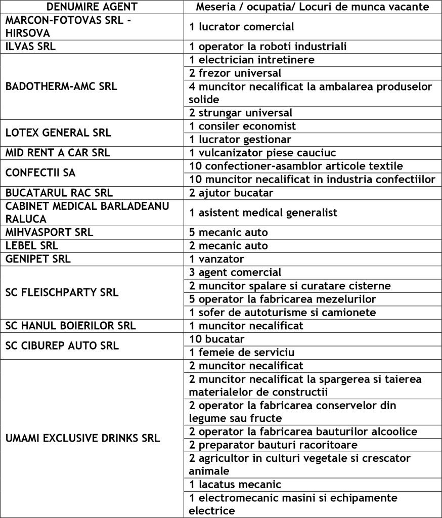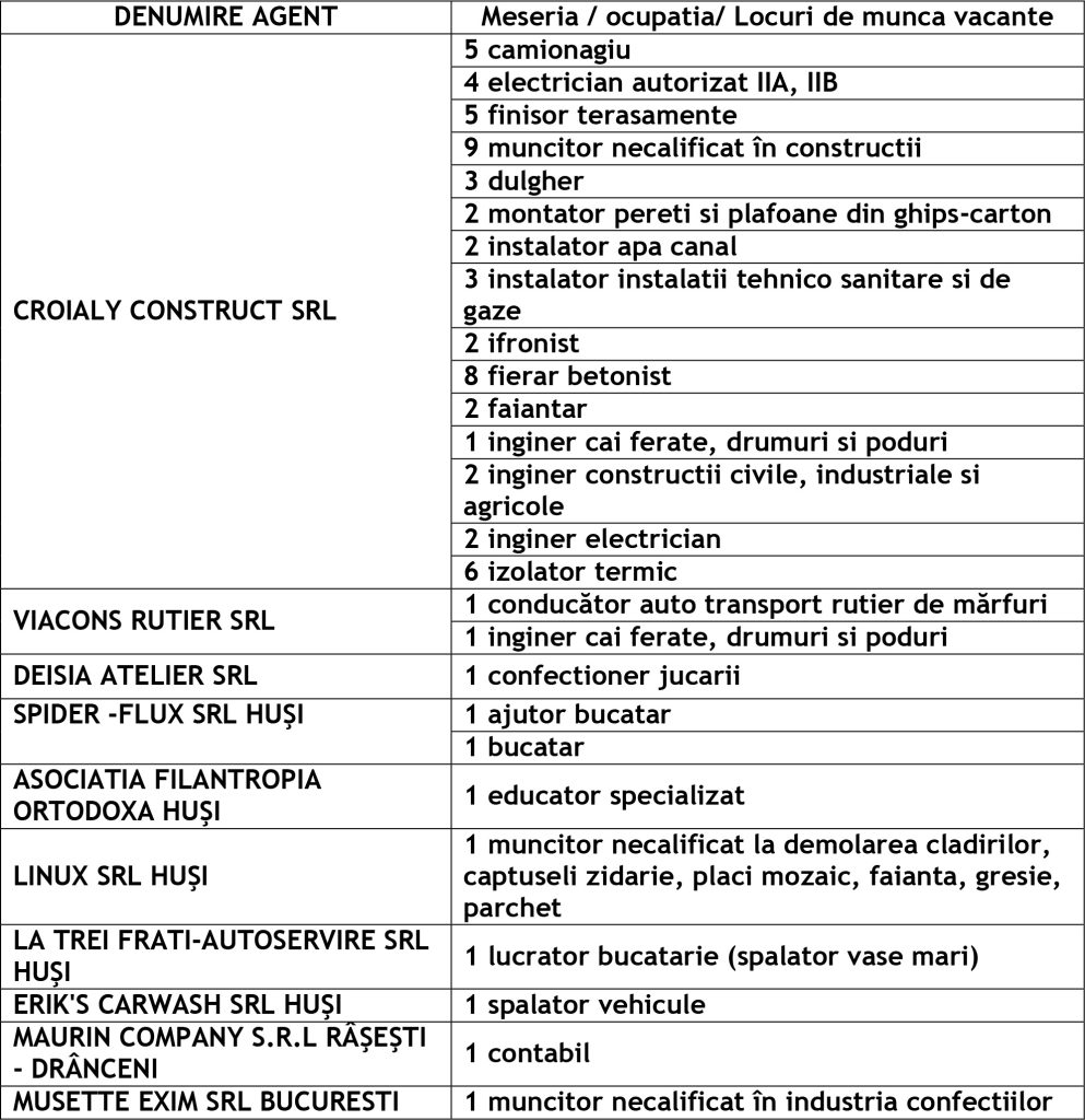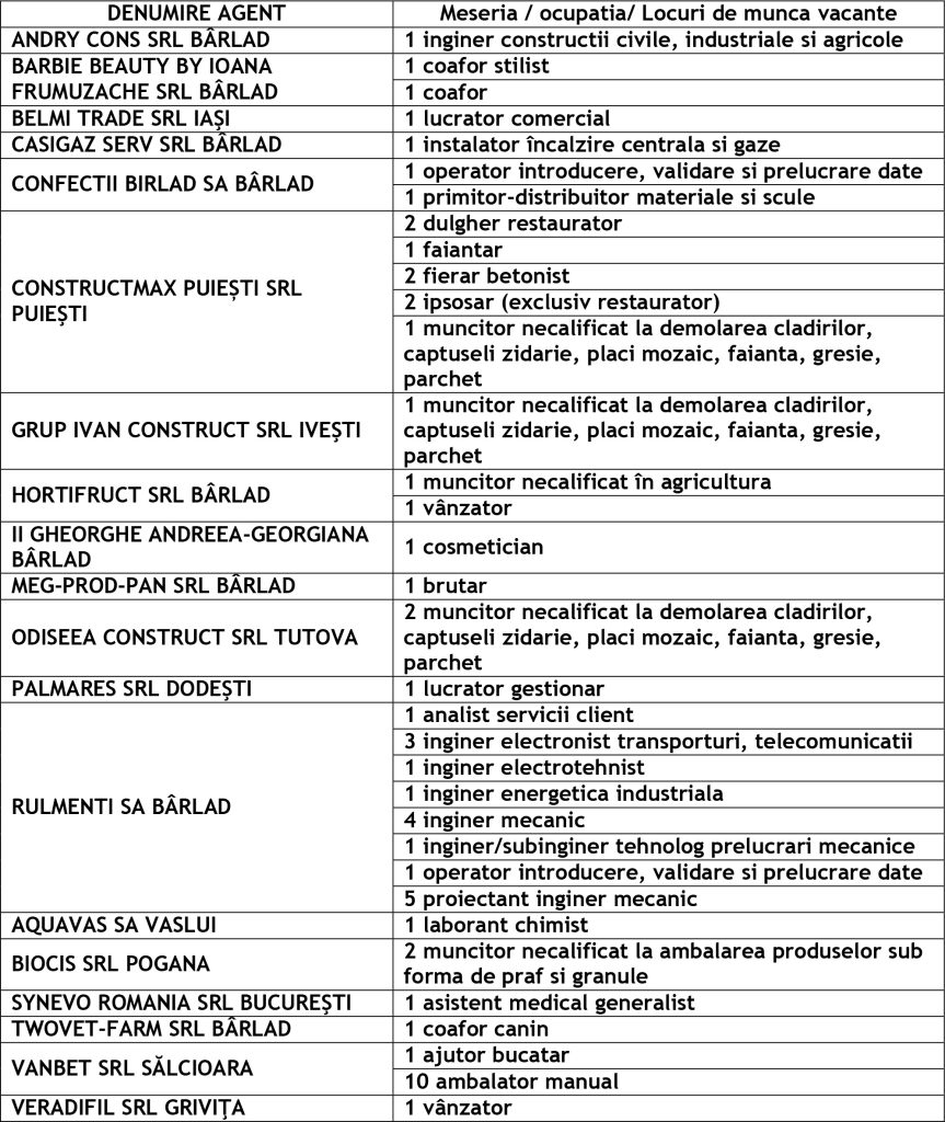 Potrivit datelor rezultate din ofertele angajatorilor privind locurile de muncă vacante, în evidențele Agenției Județene pentru Ocuparea Forței de Muncă Vaslui sunt înregistrate 206 locuri de muncă disponibile la fiecare agenție locală din județ cum ar fi: Agenția Locală Vaslui 82, Agenția Locală Bârlad 57, Agenția Locală Huși 67 locuri de muncă.
