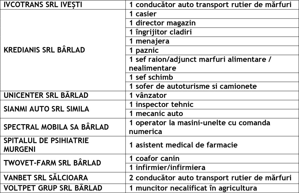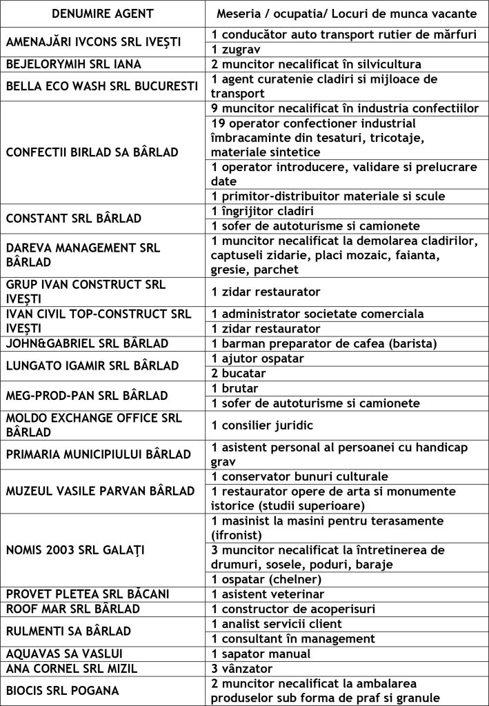 Potrivit datelor rezultate din ofertele angajatorilor privind locurile de muncă vacante, în evidențele Agenției Județene pentru Ocuparea Forței de Muncă Vaslui sunt înregistrate 272 locuri de muncă disponibile la fiecare agenție locală din județ cum ar fi: Agenția Locală Vaslui 119, Agenția Locală Bârlad 85, Agenția Locală Huși 68 locuri de muncă.