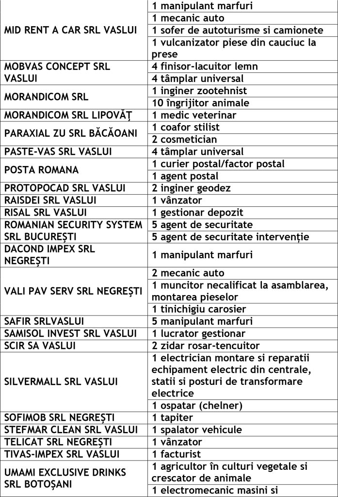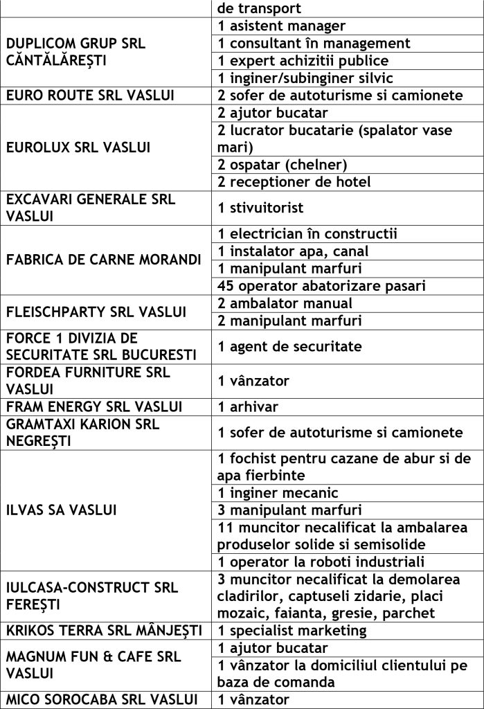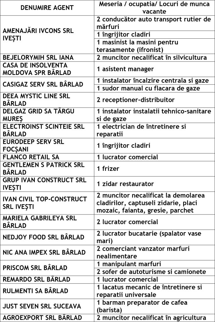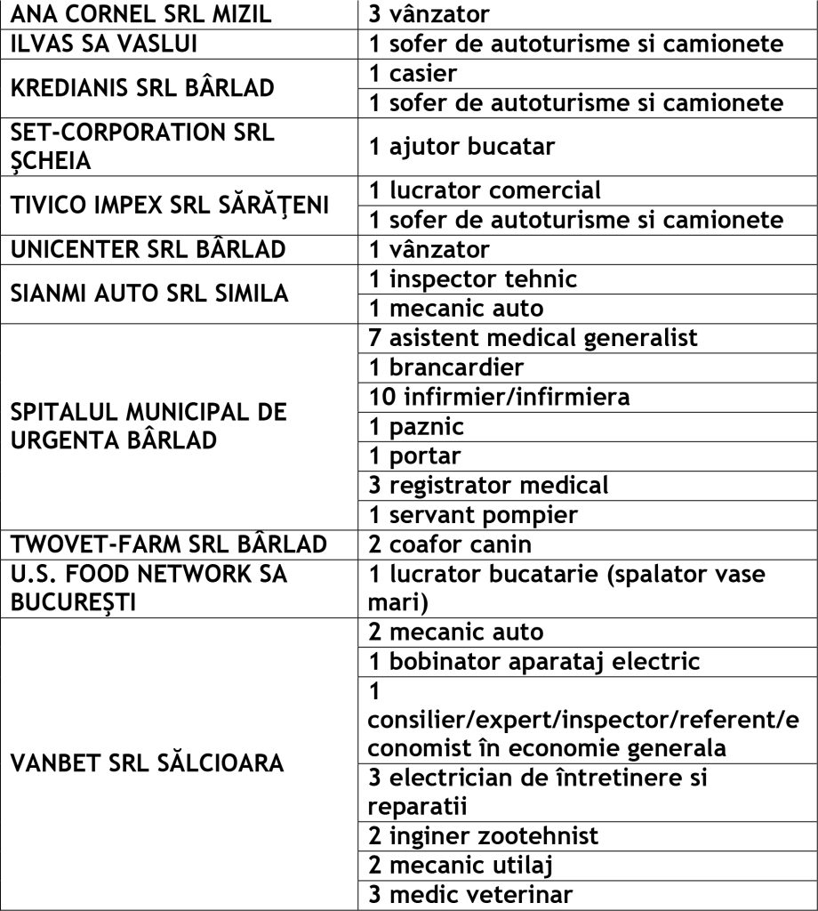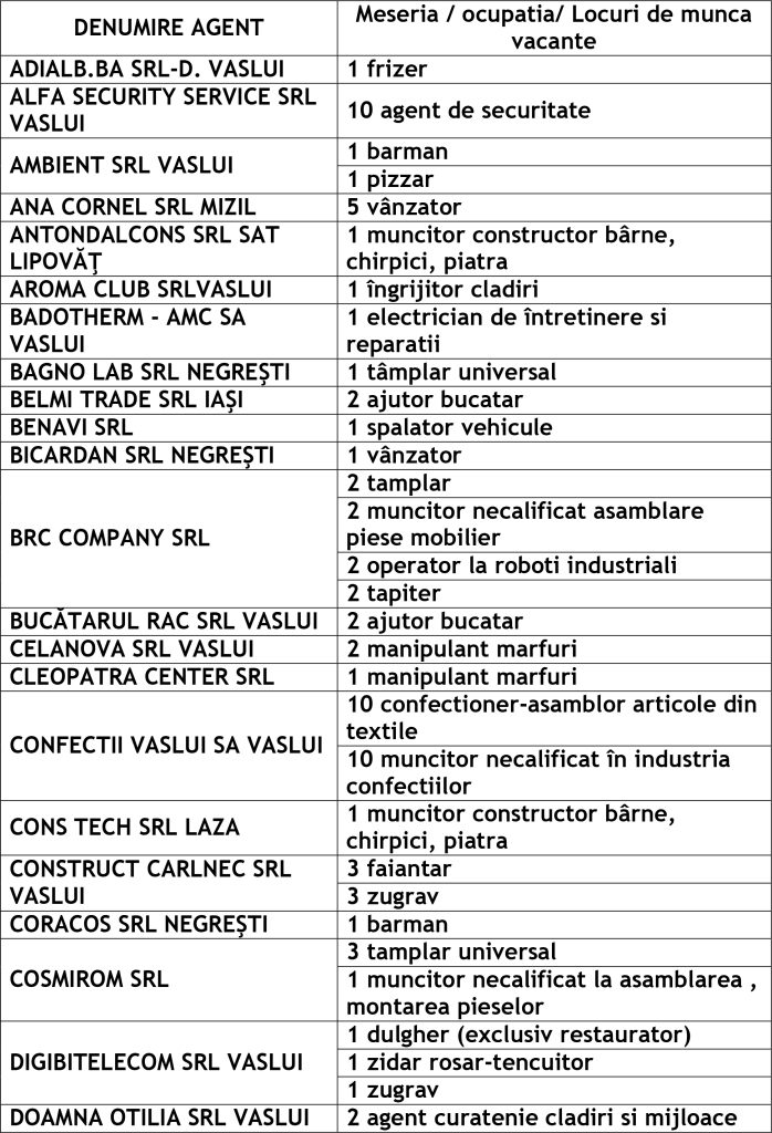 Potrivit datelor rezultate din ofertele angajatorilor privind locurile de muncă vacante, în evidențele Agenției Județene pentru Ocuparea Forței de Muncă Vaslui sunt înregistrate 435 locuri de muncă disponibile la fiecare agenție locală din județ cum ar fi: Agenția Locală Vaslui 274, Agenția Locală Bârlad 86, Agenția Locală Huși 75 locuri de muncă.