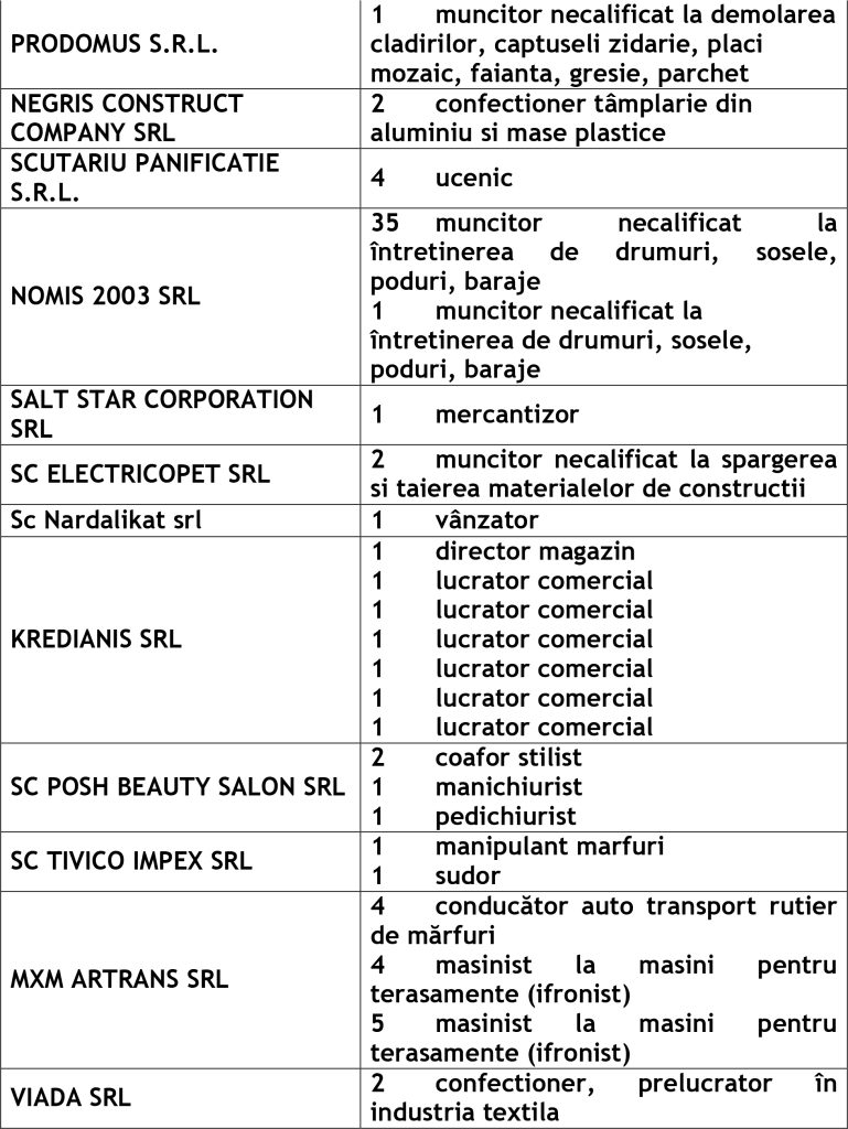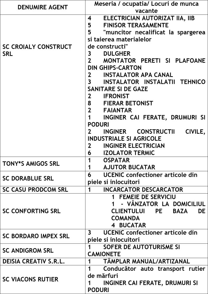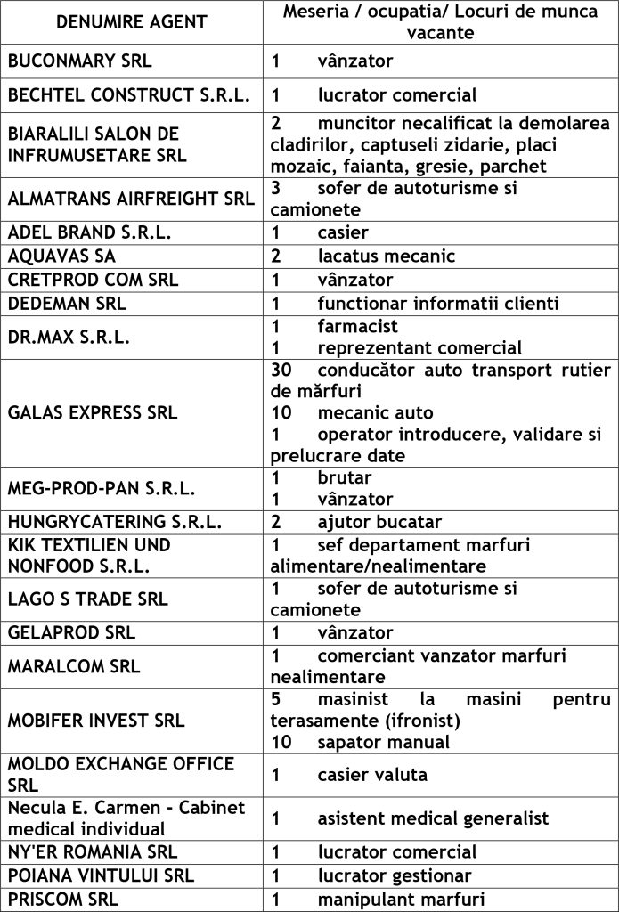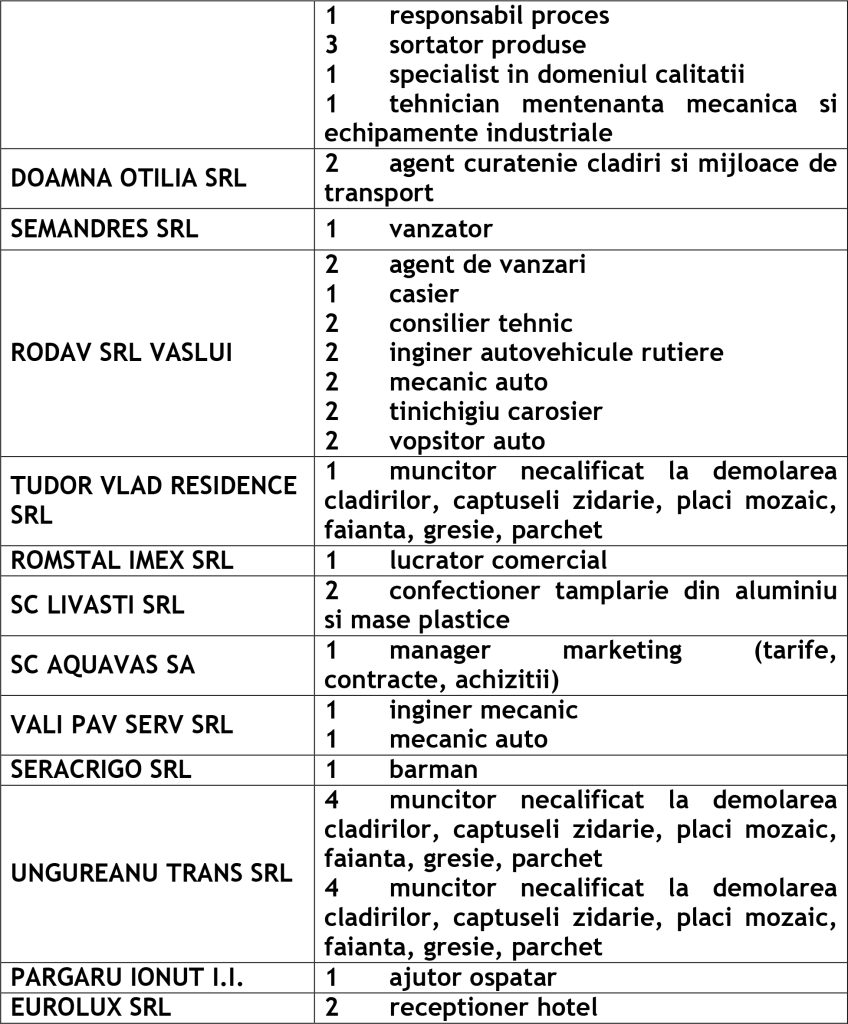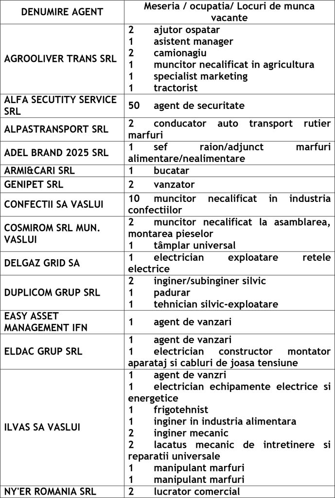 Potrivit datelor rezultate din ofertele angajatorilor privind locurile de muncă vacante, la această dată sunt disponibile la Agenția Județeană pentru Ocuparea Forței de Muncă Vaslui 366 locuri de muncă cum ar fi: Agenția Locală Vaslui 246, Agenția Locală Bârlad 51, Agenția Locală Huși 69