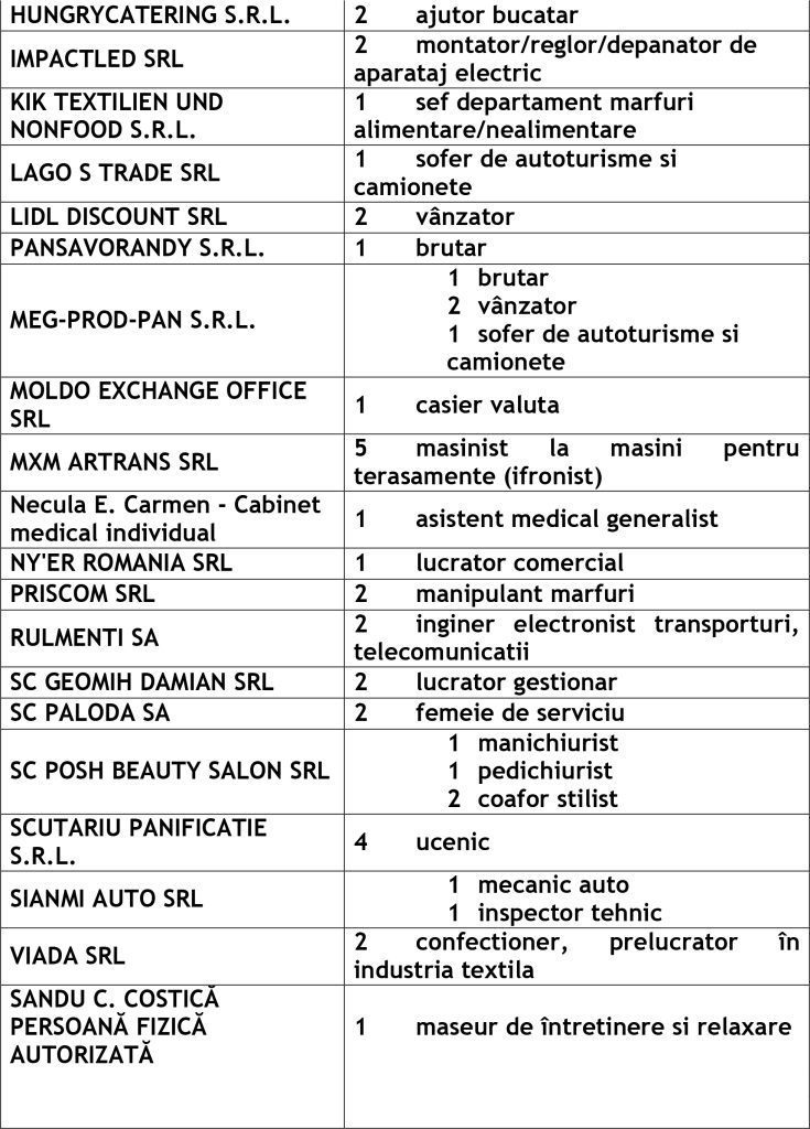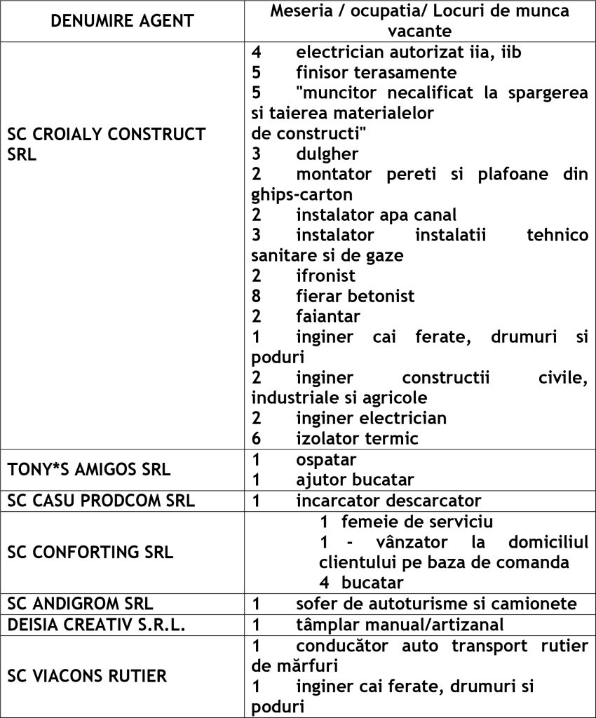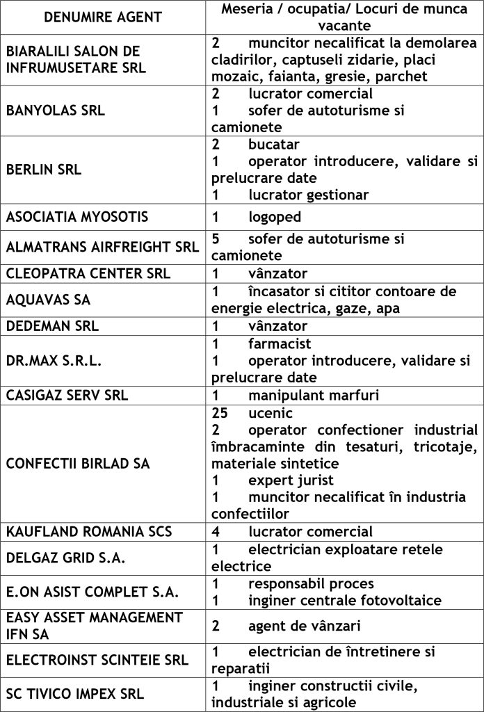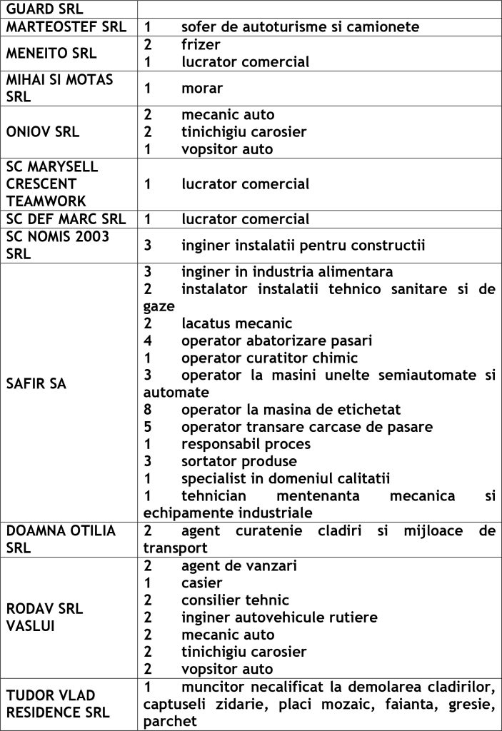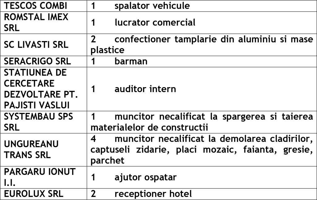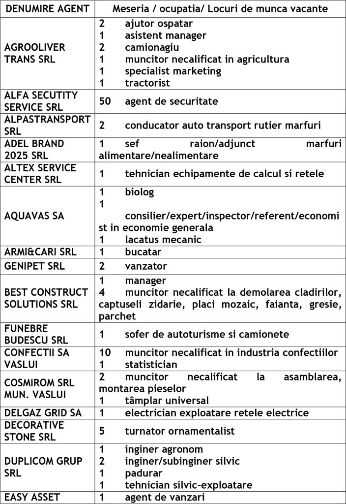 Potrivit datelor rezultate din ofertele angajatorilor privind locurile de muncă vacante, la această dată sunt disponibile la Agenția Județeană pentru Ocuparea Forței de Muncă Vaslui 455 locuri de muncă cum ar fi: Agenția Locală Vaslui 298, Agenția Locală Bârlad 97, Agenția Locală Huși 60
