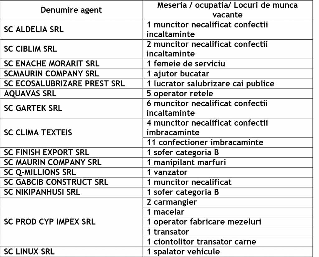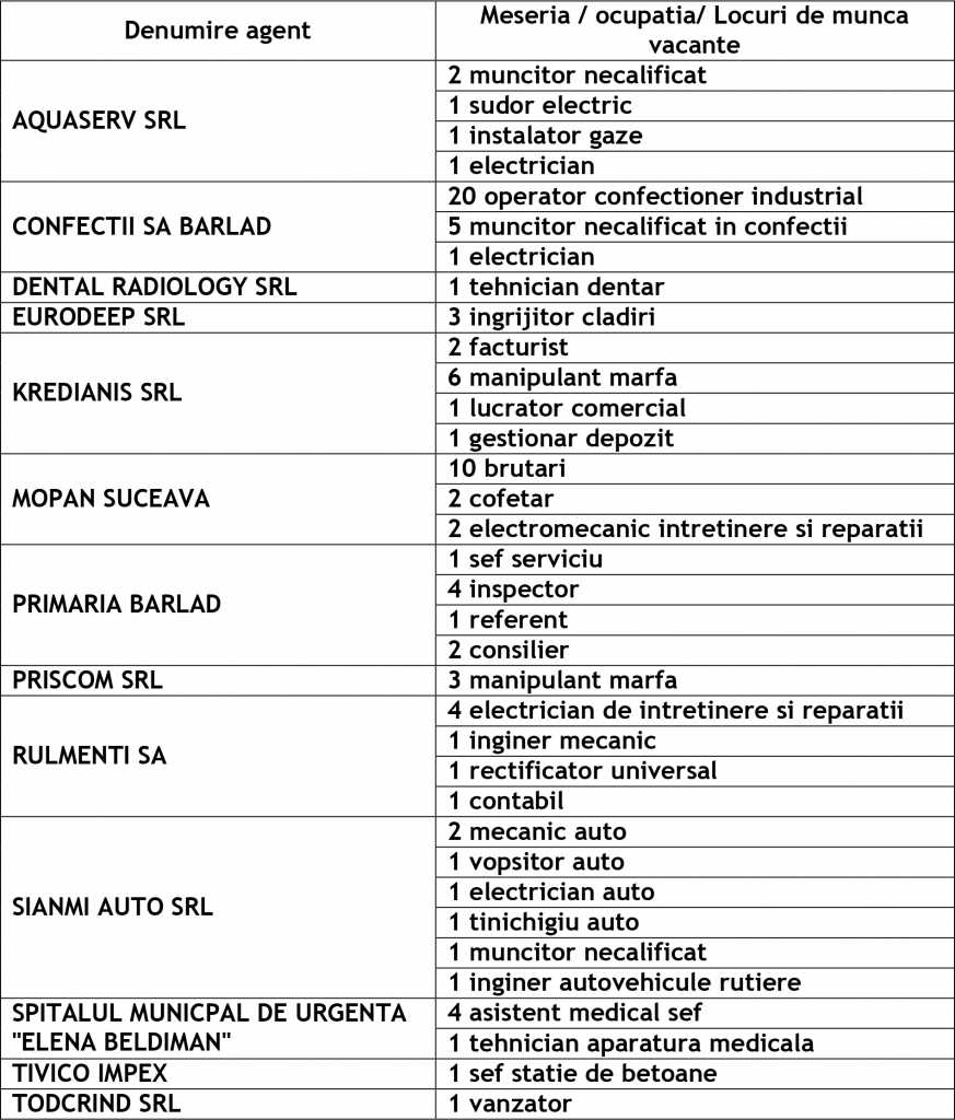 Potrivit datelor rezultate din ofertele angajatorilor privind locurile de muncă vacante, la această dată sunt disponibile la Agenția Județeană pentru Ocuparea Forței de Muncă Vaslui 328 locuri de muncă cum ar fi: Agenția Locală Vaslui 196, Agenția Locală Bârlad 88, Agenția Locală Huși 44.