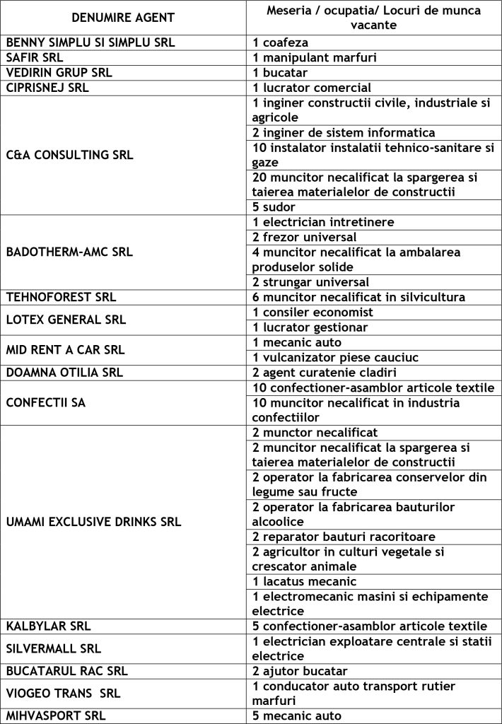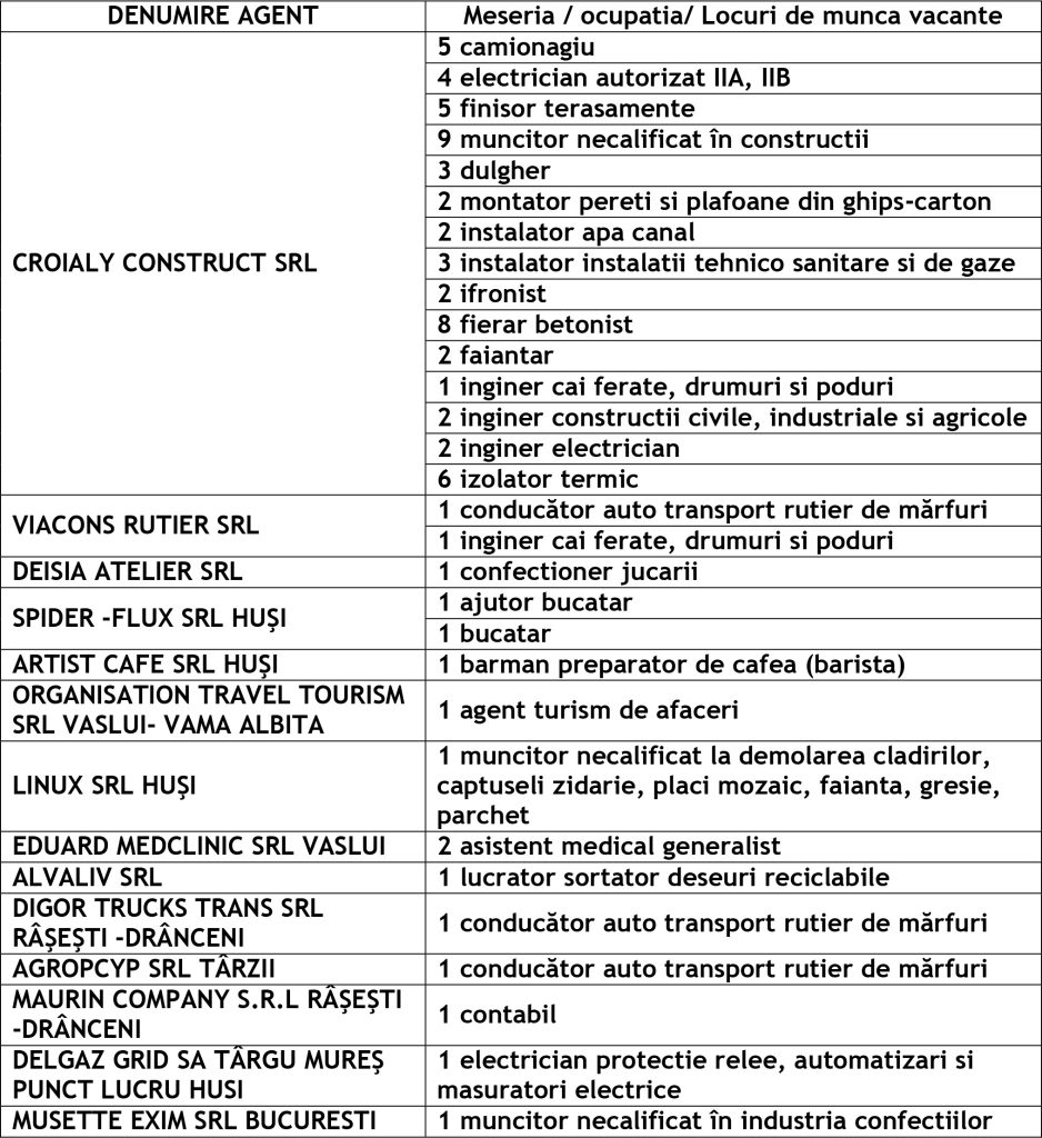 Potrivit datelor rezultate din ofertele angajatorilor privind locurile de muncă vacante, la această dată sunt disponibile la Agenția Județeană pentru Ocuparea Forței de Muncă Vaslui 226 locuri de muncă cum ar fi: Agenția Locală Vaslui 117, Agenția Locală Bârlad 37, Agenția Locală Huși 72