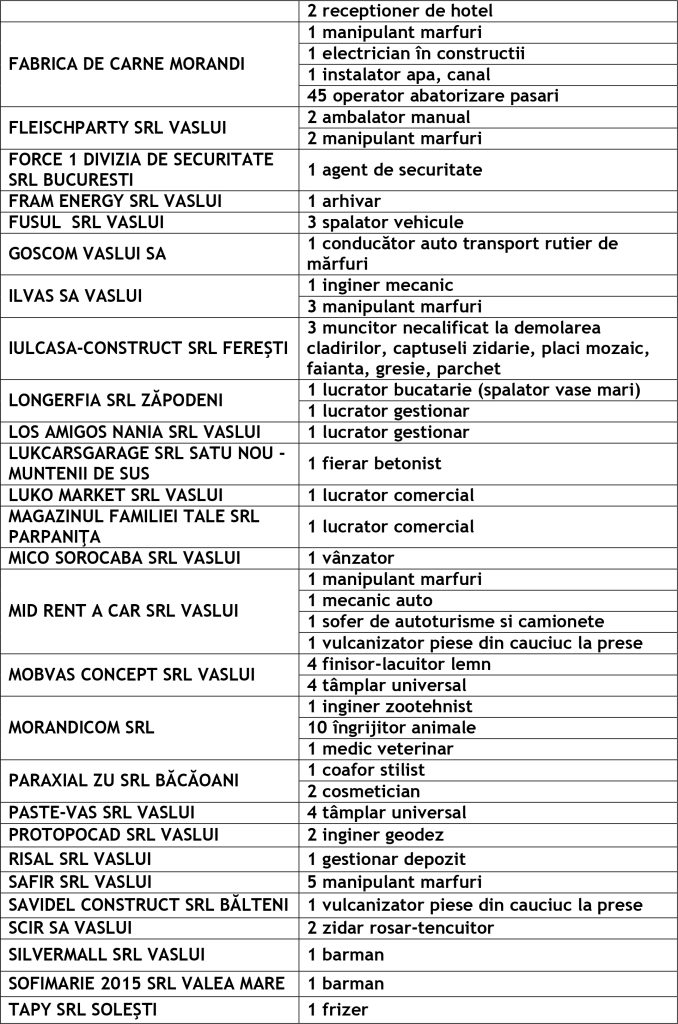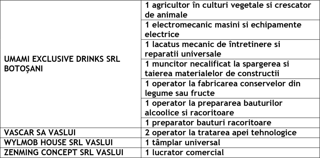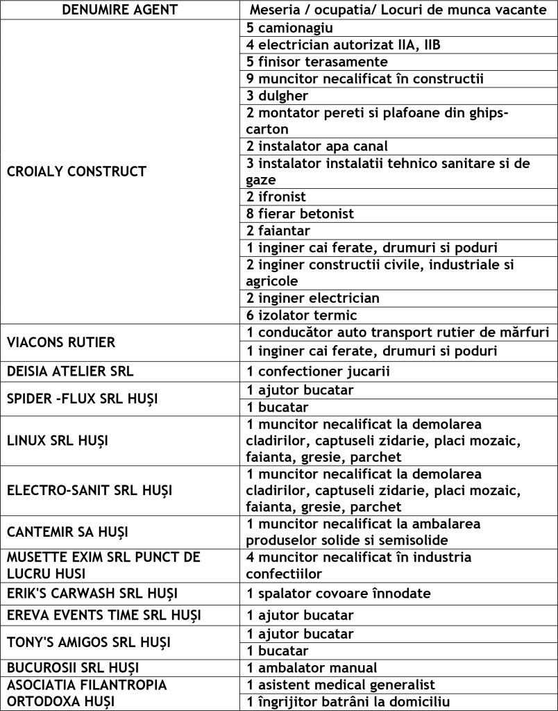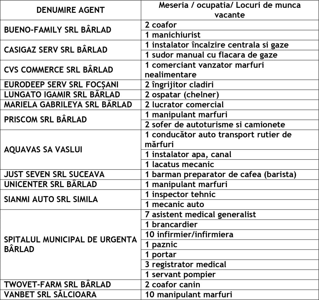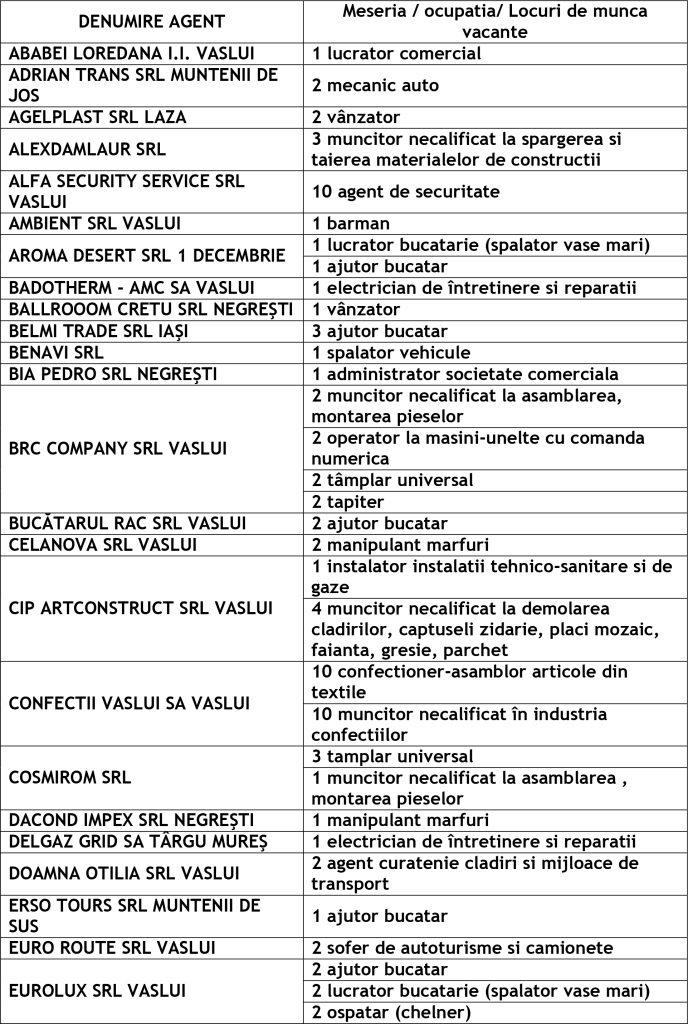 Potrivit datelor rezultate din ofertele angajatorilor privind locurile de muncă vacante, la această dată sunt disponibile la Agenția Județeană pentru Ocuparea Forței de Muncă Vaslui 345 locuri de muncă cum ar fi: Agenția Locală Vaslui 212, Agenția Locală Bârlad 58, Agenția Locală Huși 75