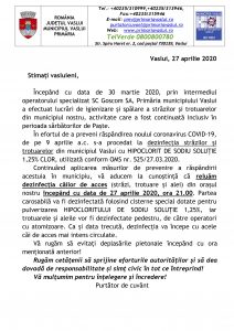 “Continuând aplicarea măsurilor de prevenire a răspândirii acestuia în municipiu, vă aducem la cunoștință că reluăm dezinfecția căilor de acces (străzi, trotuare și alei) din orașul nostru începând cu data de 27 aprilie 2020, ora 21.00. Partea carosabilă va fi dezinfectată folosind cisterne special dotate pentru pulverizarea HIPOCLORITULUI DE SODIU SOLUȚIE 1,25%, iar trotuarele și aleile vor fi dezinfectate pedestru, de către operatori cu atomizoare. Ca și data trecută, dezinfecția va începe cu acele căi de acces mai intens circulate.