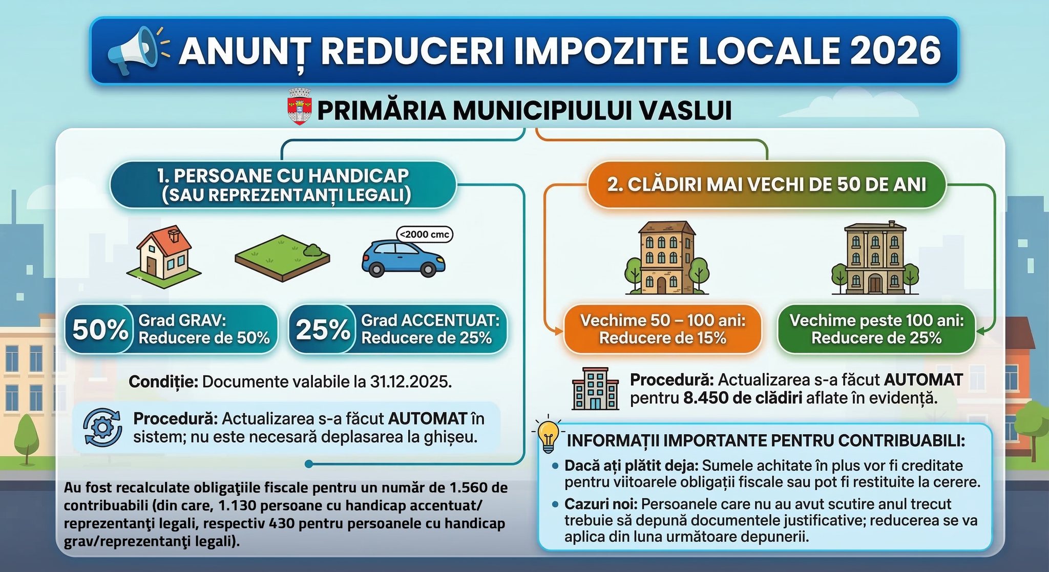 Primăria Municipiului Vaslui informează că, în baza OUG nr. 9/2026, au fost recalculate impozitele locale pentru anul în curs, acordându-se următoarele reduceri: