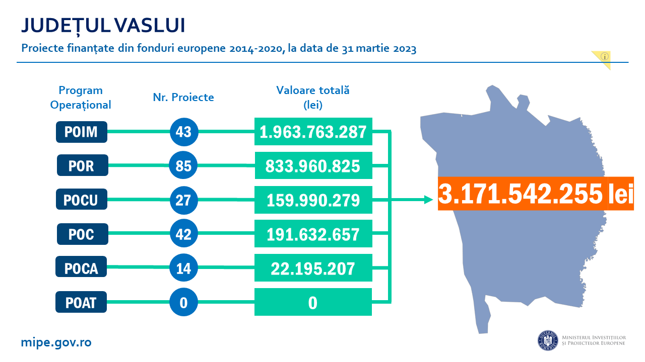 Iată că o serie de statistici ale Ministerului Investiţiilor şi Proiectelor Europene au luat în calcul axele de finanţare propuse în cadrul exerciţiul de finanţare a Uniunii Europene 2014-2020, care se află pe final de derulare: Programul Operaţional Infrastructura Mare (P.O.I.M.), Programul Operațional Capital Uman (P.O.C.U.), Programul Operațional Competitivitate (P.O.C.), Programul Operațional Regional (P.O.R.) şi Programul Operațional Capacitate Administrativă (P.O.C.A.). Precizăm că analiza în discuție nu face referire la fondurile europene atrase prin P.N.R.R., care nu este inclus în exercițiul financiar 2014-2020 al Uniunii Europene.