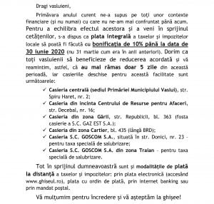 Primăvara anului curent ne-a supus pe toți unor contexte financiare (și nu numai) cu care nu ne-am mai confruntat până acum. Pentru a echilibra efectul acestora și a veni în sprijinul cetățenilor, s-a dispus ca plata integrală a taxelor și impozitelor locale să poată fi făcută cu bonificația de 10% până la data de 30 iunie 2020 (nu 31 martie cum era în anii anteriori). Dorim ca toți vasluienii să beneficieze de reducerea acordată și vă reamintim, astfel, că au mai rămas doar 5 zile din această perioadă, iar casieriile deschise pentru această facilitate sunt următoarele: