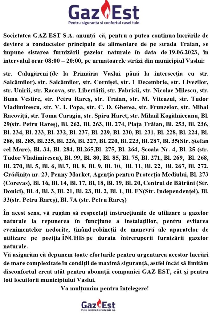 Home Comunitate VIDEO//ANUNȚ SC GAZ EST SA:Sistare furnizare gaze naturale în municipiul Vaslui, în data de 19 Iunie 2023