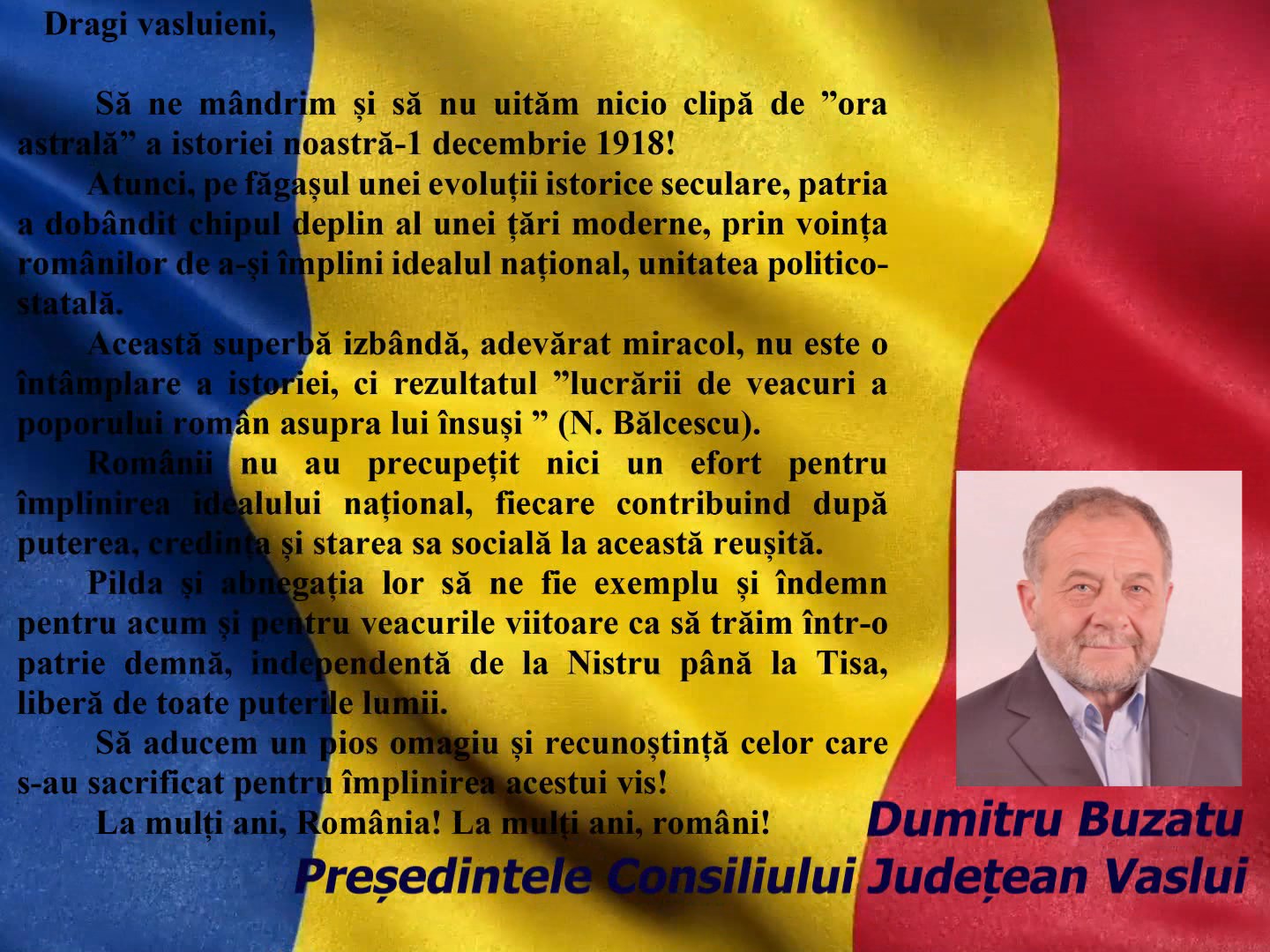 Home Emisiuni VIDEO// MESAJ DE ZIUA NAȚIONALĂ A ROMÂNIEI – DUMITRU BUZATU, PREȘEDINTELE CJ VASLUI
