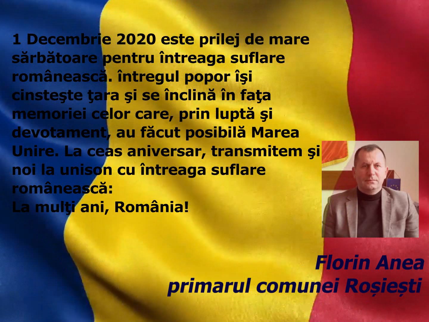 VIDEO// MESAJ DE ZIUA NAȚIONALĂ A ROMÂNIEI – FLORIN ANEA, PRIMARUL COMUNEI ROȘIEȘTI