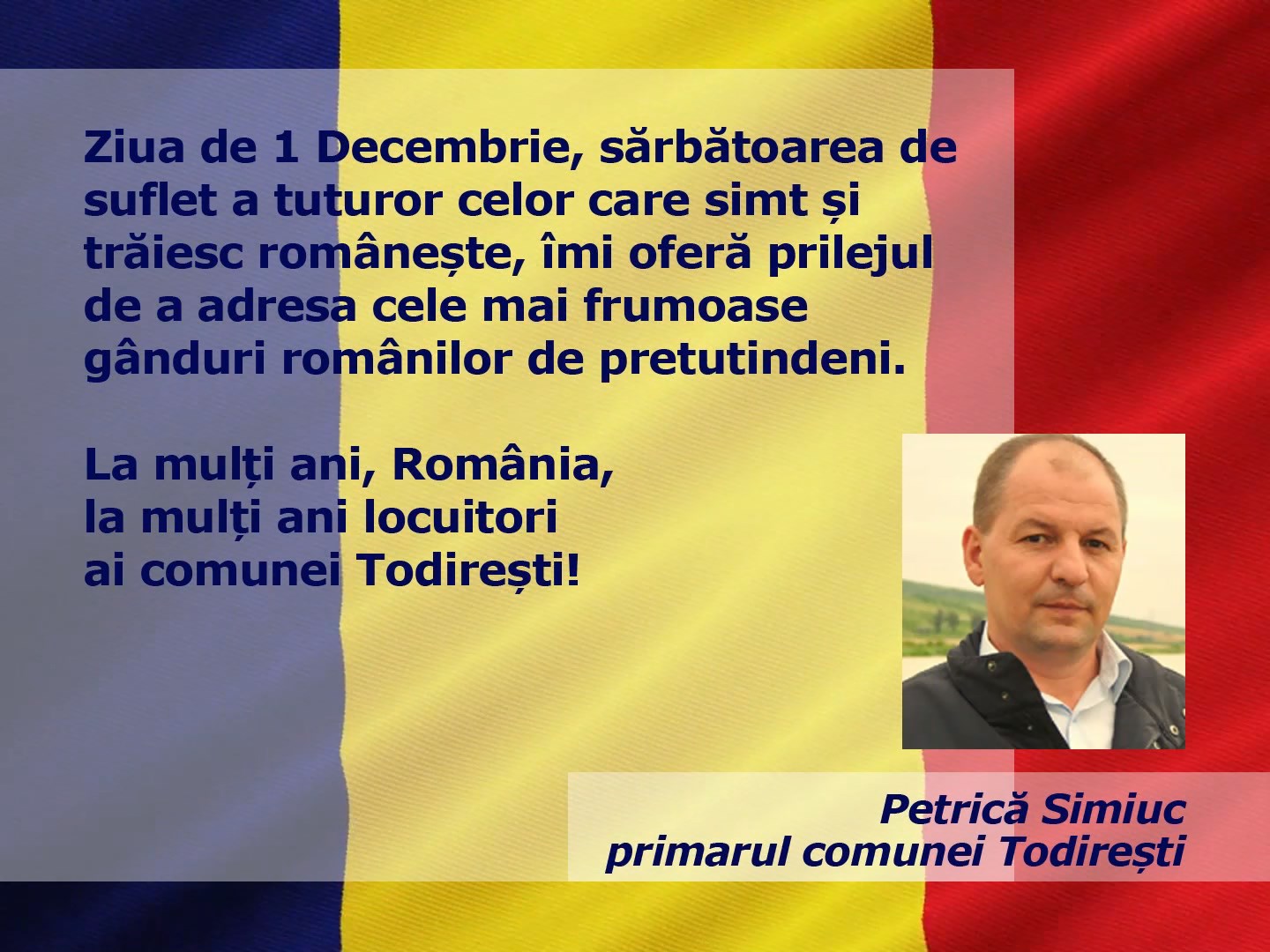 Home Emisiuni VIDEO// MESAJ DE ZIUA NAȚIONALĂ A ROMÂNIEI – PETRICĂ SIMIUC, PRIMARUL COMUNEI TODIREȘTI