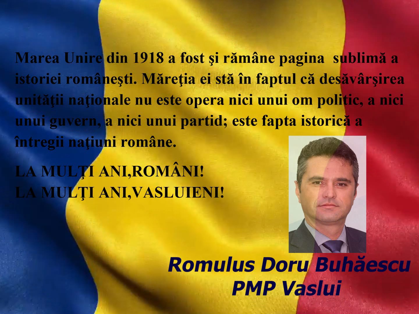 VIDEO//MESAJ DE ZIUA NAȚIONALĂ A ROMÂNIEI – ROMULUS DORU BUHĂESCU, PMP VASLUI