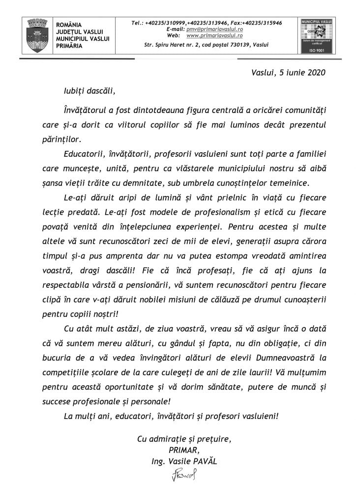 VIDEO//Mesajul primarului municipiului Vaslui de Ziua Învățătorului