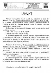 Primăria municipiului Vaslui anunță că, începând cu data de 17 iunie 2020, s-a deschis în zona Cartier, str. Ştefan cel Mare, bl. 435, sc. A, parter, un nou punct de lucru cu publicul, unde funcţionează o casierie a Serviciului Finanţe Publice Locale în vederea încasării impozitelor şi taxelor locale.