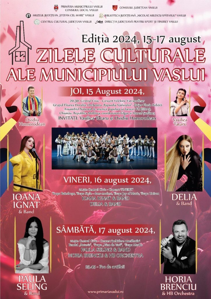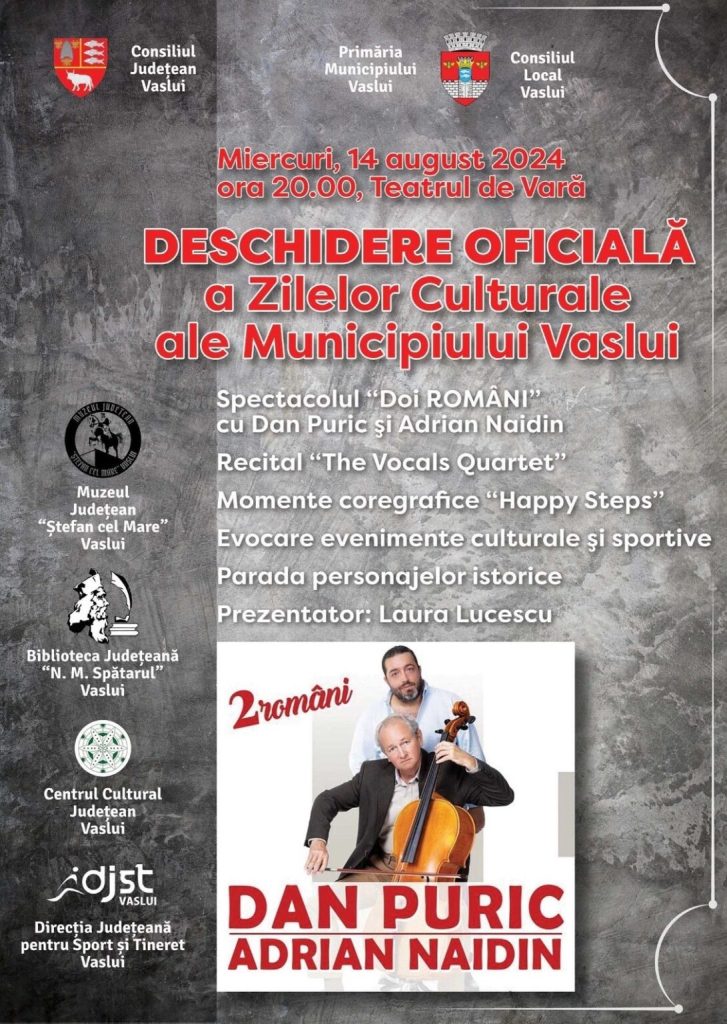 Timp de trei zile, 15-17 august, vasluienii vor avea ocazia de a se distra atât în centrul orașului, cât și în parcul Copou, cu ocazia Zilelor Vasluiului, Primăria Vaslui propunându-și un maraton de manifestări cultural-artistice, sportive și de agrement. Festivitatea de deschidere este programată pentru miercuri, 14 august, ora 20, la Teatrul de Vară, unde va avea loc un spectacol susținut de Dan Puric și Adrian Naidin, urmat de recitalul trupei „The Vocals Quartet”.